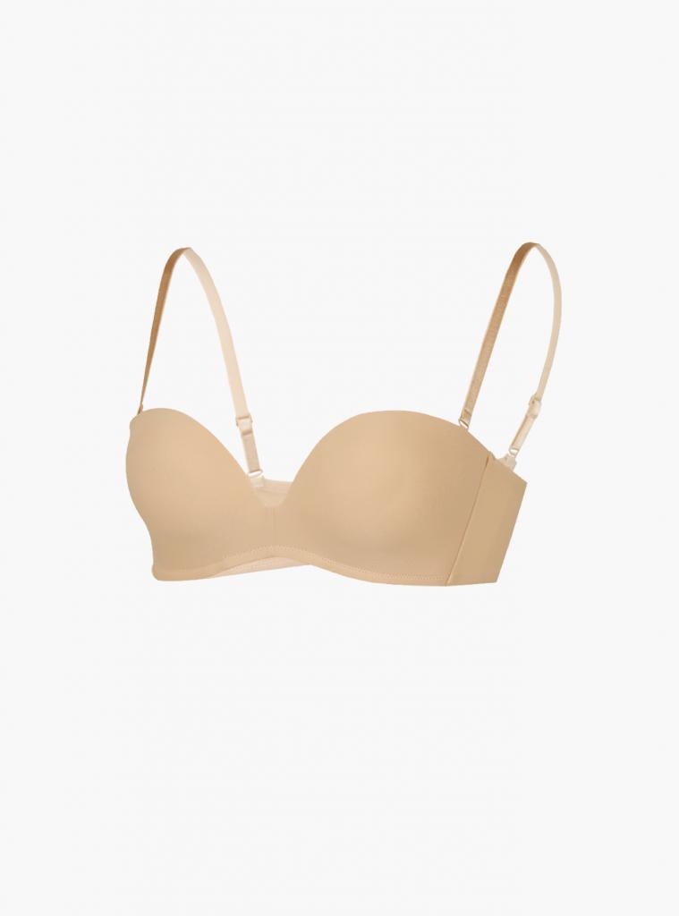 Бюстгальтер от торговой марки Индефини. Бюстгальтер бежевого цвета на тонких съемных бретелях изготовлен из эластичной синтетической ткани, дополнен Push-up с формованными чашками и косточками по бокам для лучшей поддержки груди. Застежки на широком поясе обеспечивают несколько вариантов ширины пояса.