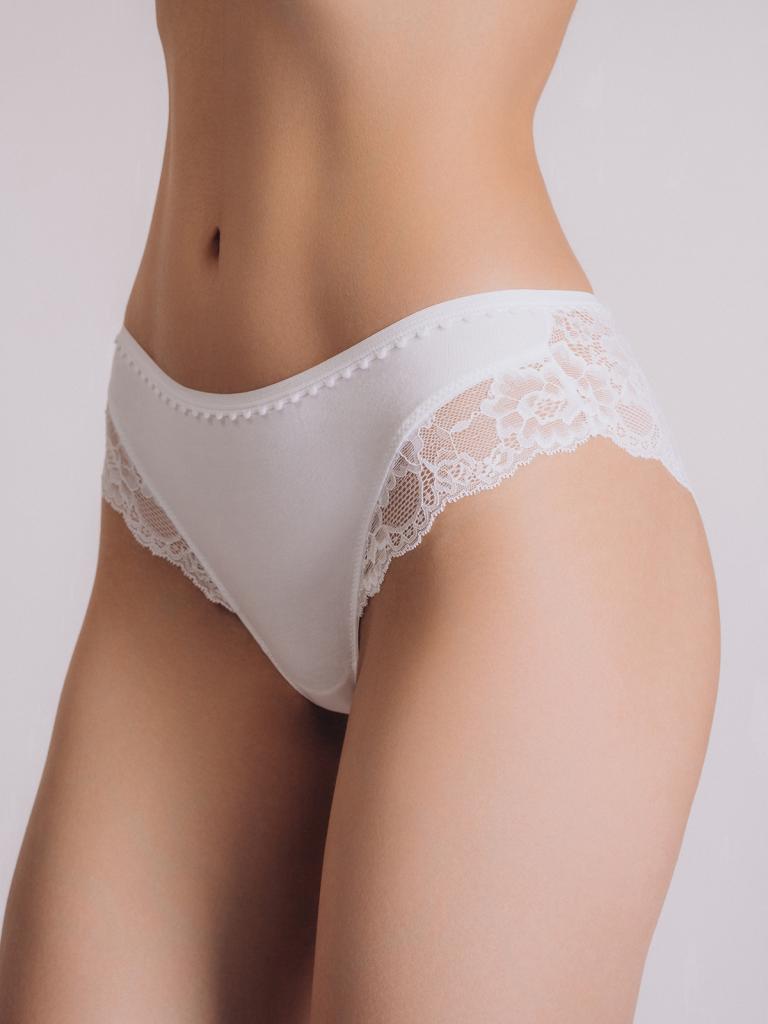Белые трусы-слипы из натуральных материалов. Задняя часть украшена изящным кружевом, которое плавно перетекает на переднюю часть, создавая эффект рюшек в передней части.