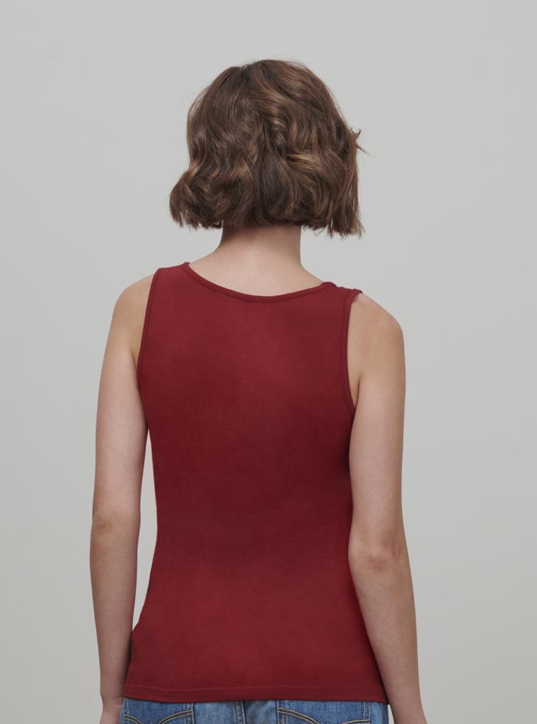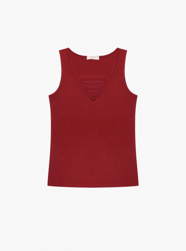 Женская майка-топ от торговой марки Индефини. Майка из хлопка, красного цвета, с кружевной вставкой на вырезе, без рукавов, с V-образным вырезом, прямая, прилегающая.
