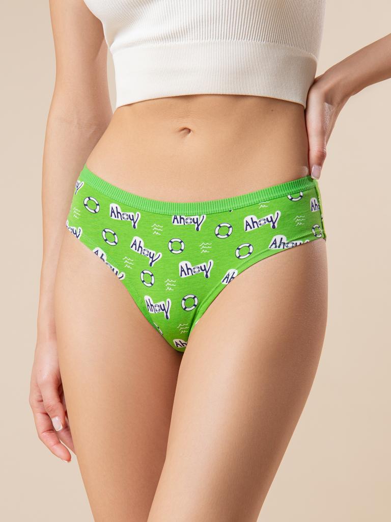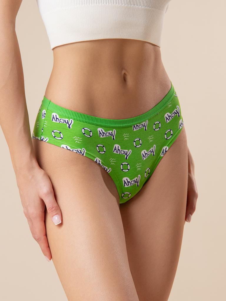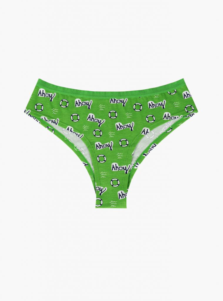 Трусы танга женские, изготовленные из мягкого хлопка, комфортные и свободные в носке, не сковывают движений. Резинка на талии не сдавливает и не натирает кожу. Трусы имеют среднюю посадку, выполнены в светло-зеленом цвете и украшены принтом с надписью «Ahoy».