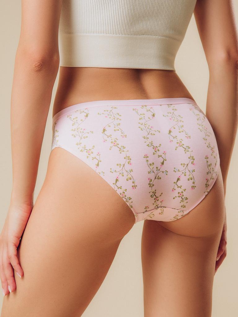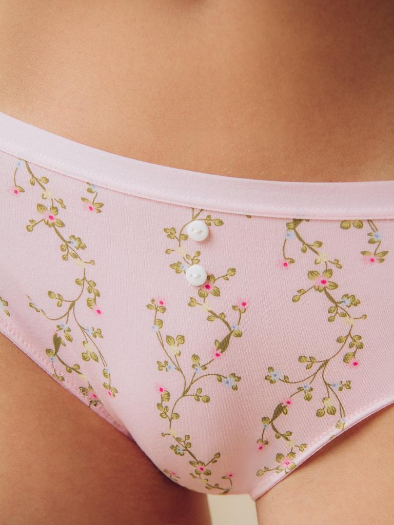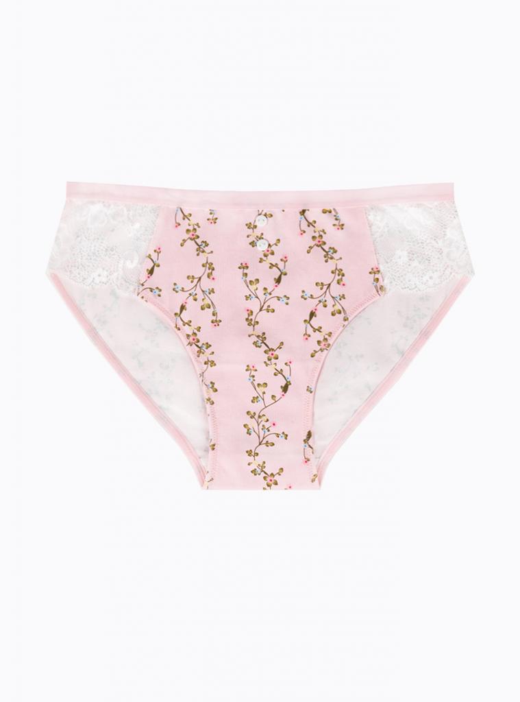 Трусы слипы женские изготовлены из хлопка и выполнены в розовом цвете с нанесенным цветочным принтом. Трусы на мягкой эластичной резинке с боковыми кружевными вставками. На передней части расположены две белые декоративные пуговицы.