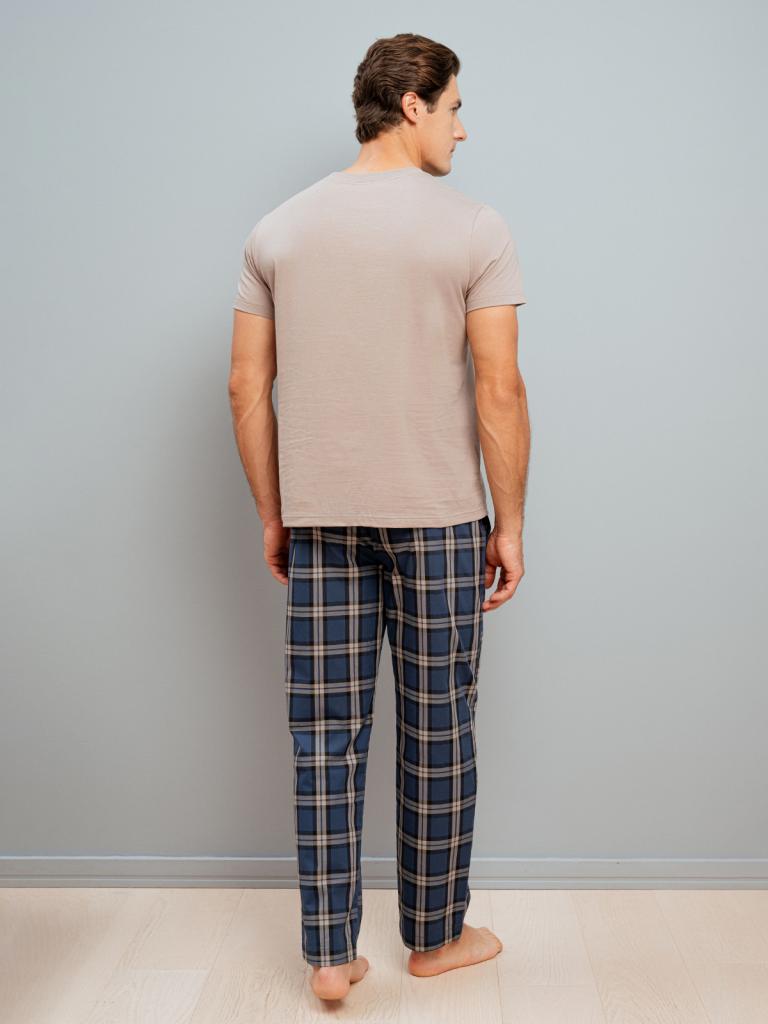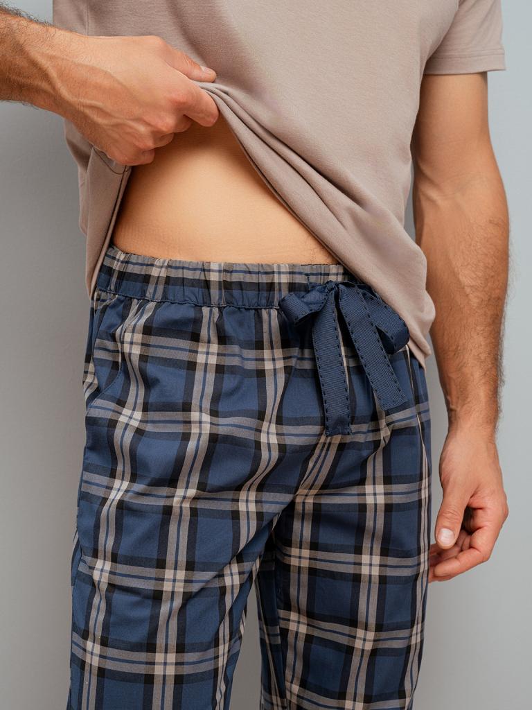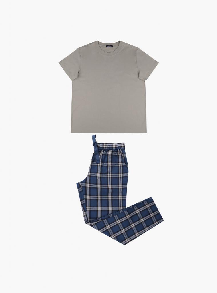 Мужская пижама, изготовленная из хлопка, состоит из футболки и брюк. Футболка свободного кроя с короткими рукавами и круглым вырезом. Брюки прямого кроя с мягкой эластичной резинкой и регулирующим поясом обеспечивают оптимальную посадку. Брюки украшены клетчатым принтом.