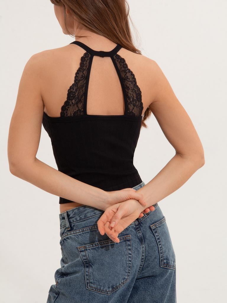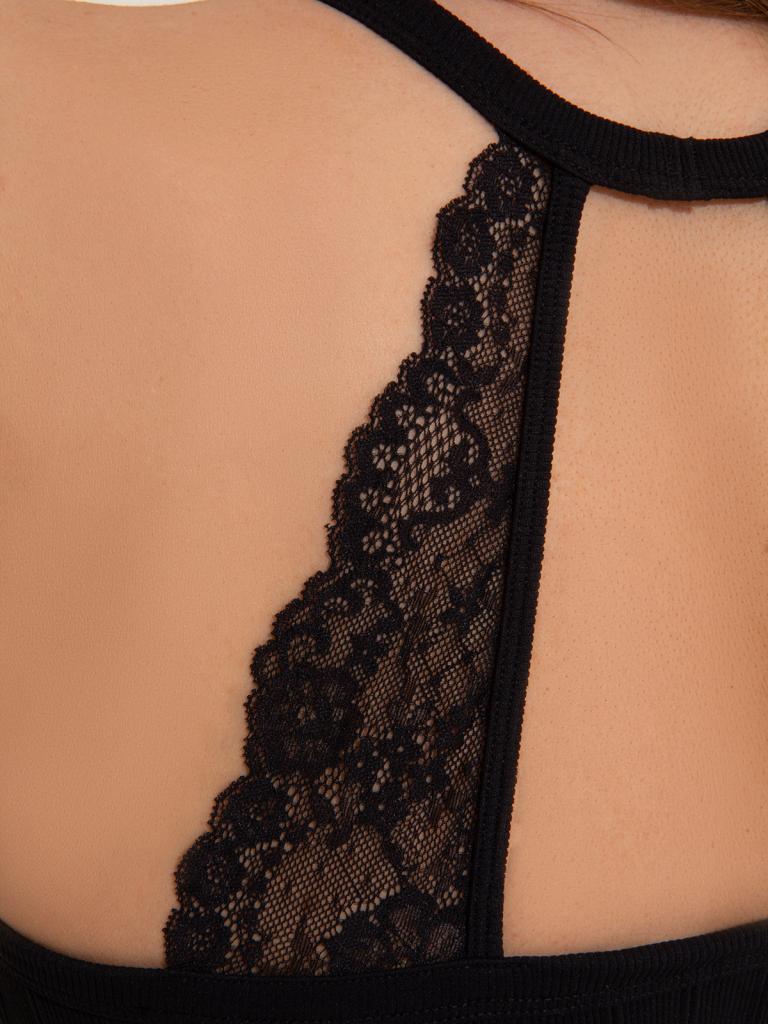 Женский топ на тонких бретелях из полиамида очень мягкий на ощупь, приятный к телу, хорошо впитывает влагу и не деформируется после стирки. Он изготовлен из материала, который обеспечивает отличную эластичность и комфорт при носке. Топ будет отлично сидеть по фигуре благодаря плотной резинке снизу и при этом комфортно ощущаться на коже. Сзади модель украшена кружевными узорами.