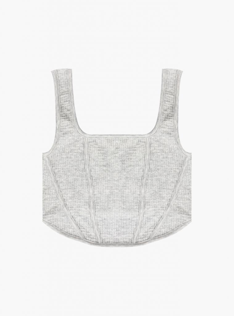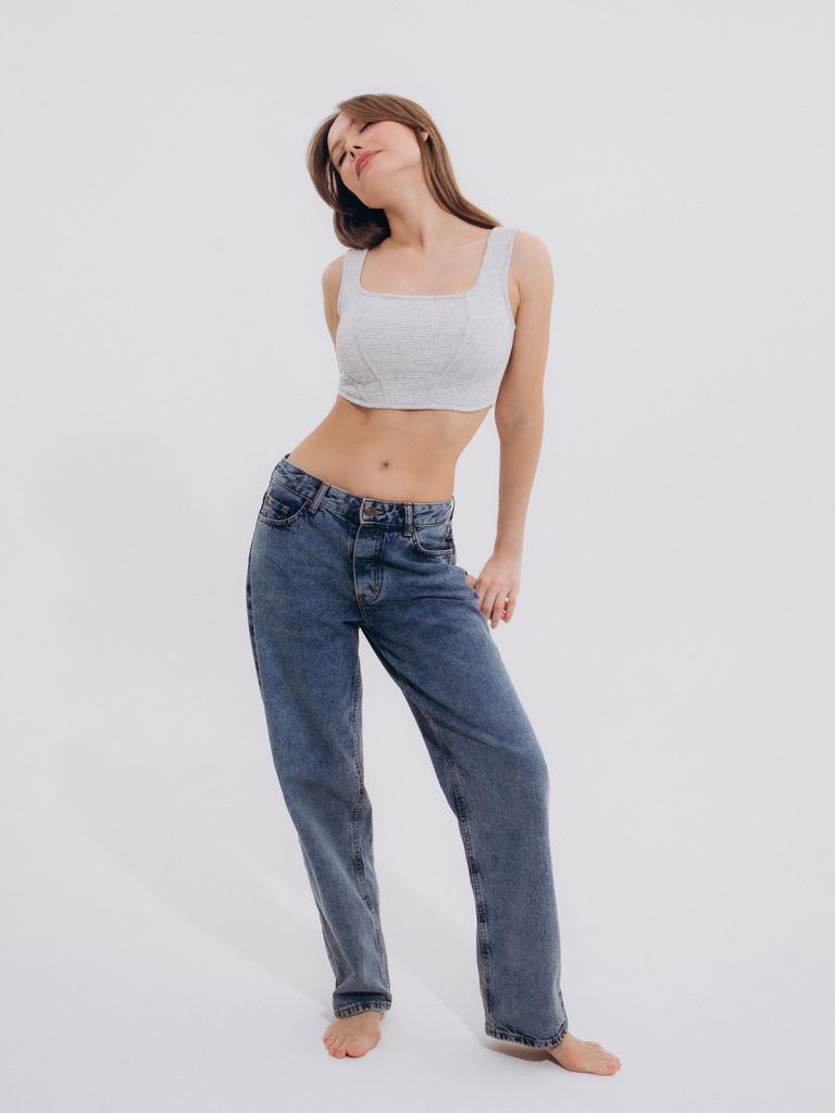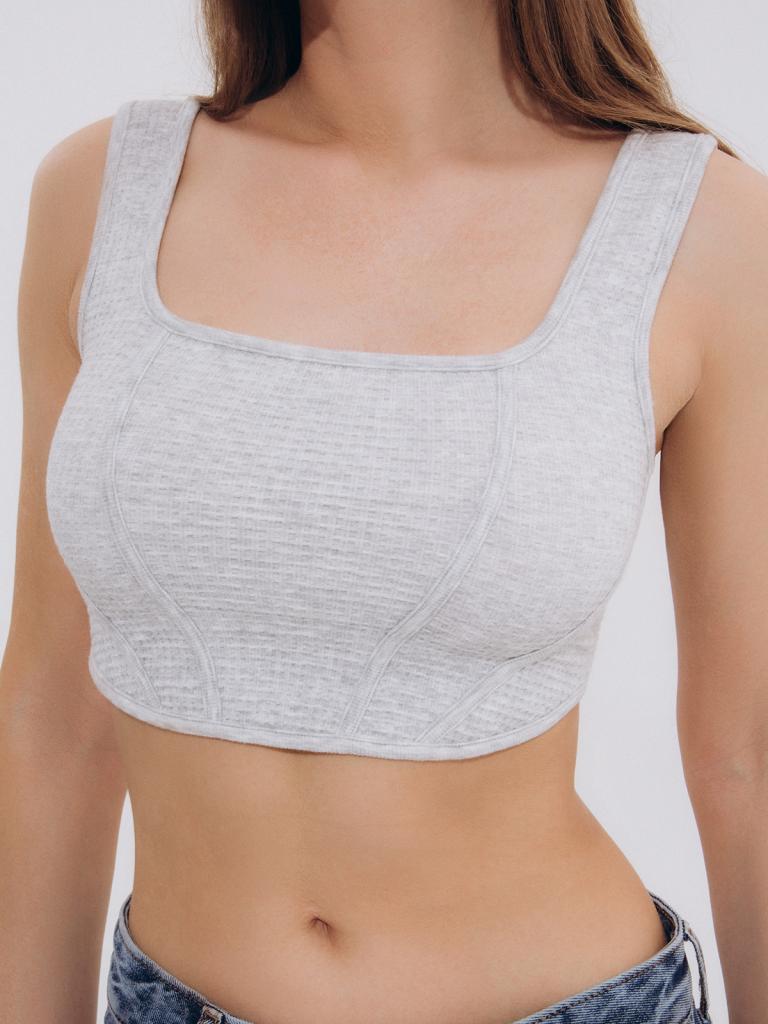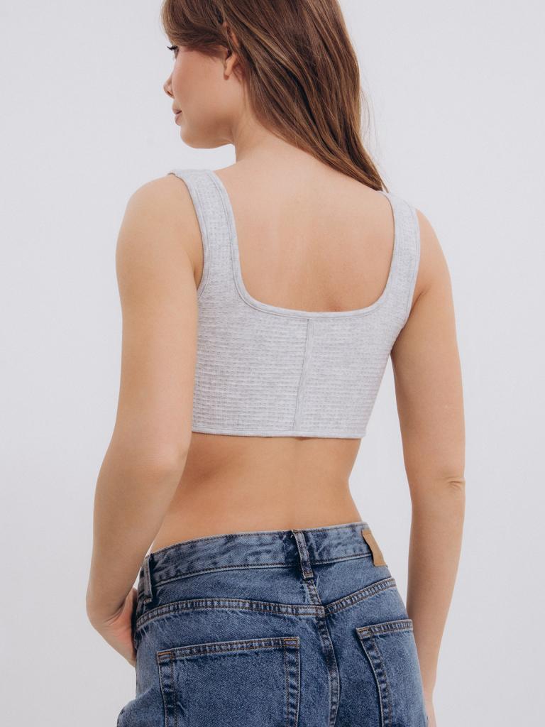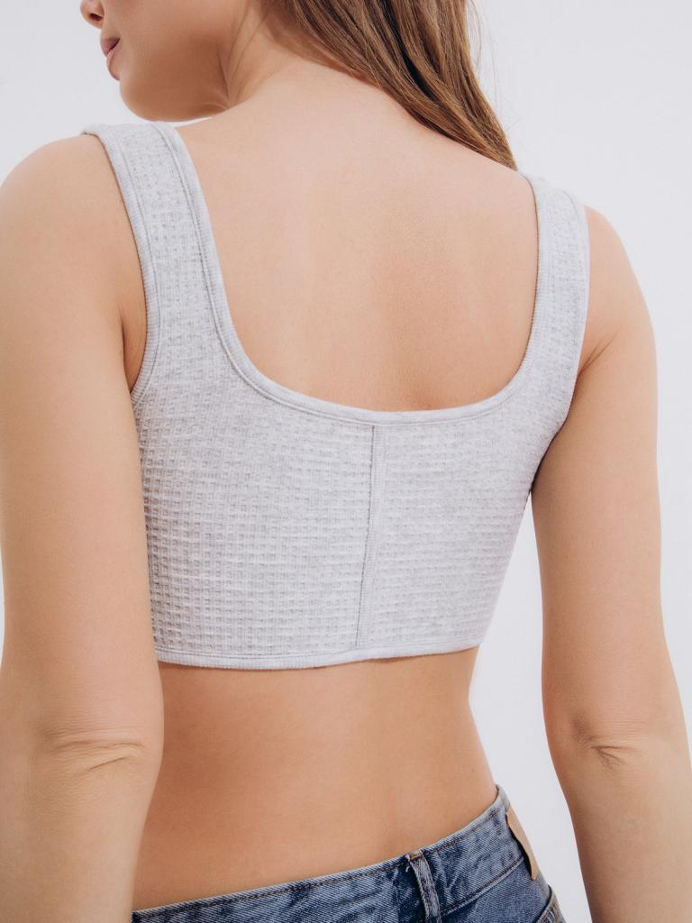 Топ женский изготовлен из смесовой ткани и выполнен в сером цвете с фактурной тканью и с широкими бретелями. Он фиксируется во время носки мягкой эластичной резинкой на верхнем и нижнем вырезах.