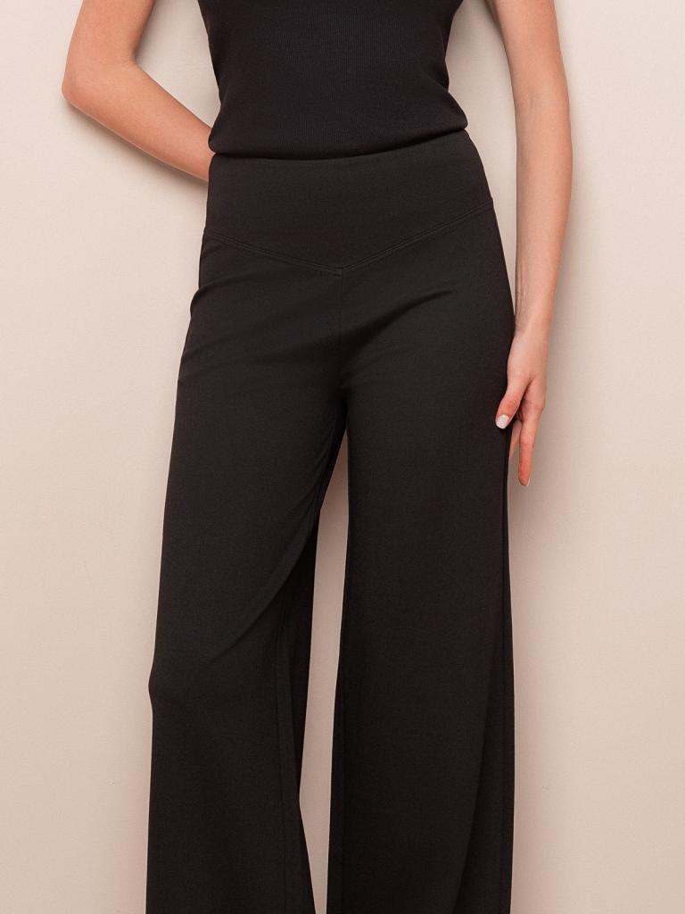 Элегантные черные брюки расклешенного кроя, создающие эффектный силуэт в духе 70-х. Сшиты из мягкой смесовой ткани с преобладанием вискозы для комфорта и полиамида для сохранения формы.