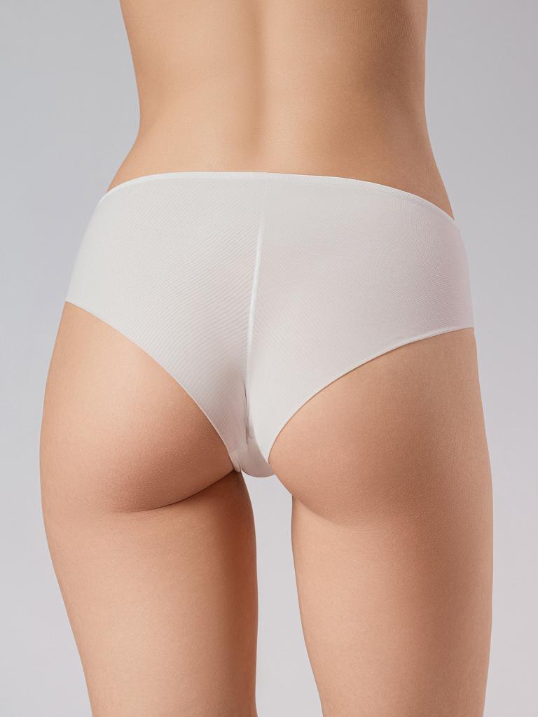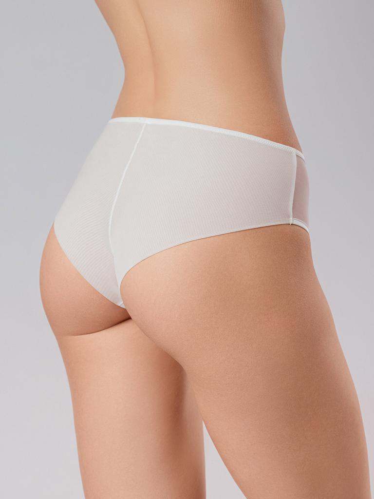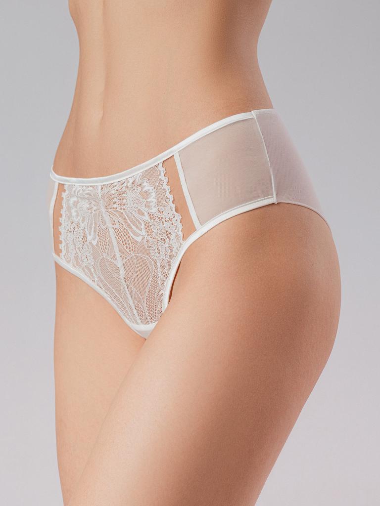 Женские трусы-слипы Indefini выполнены в нежном белом цвете с кружевом персикового оттенка с цветочными мотивами по центру.