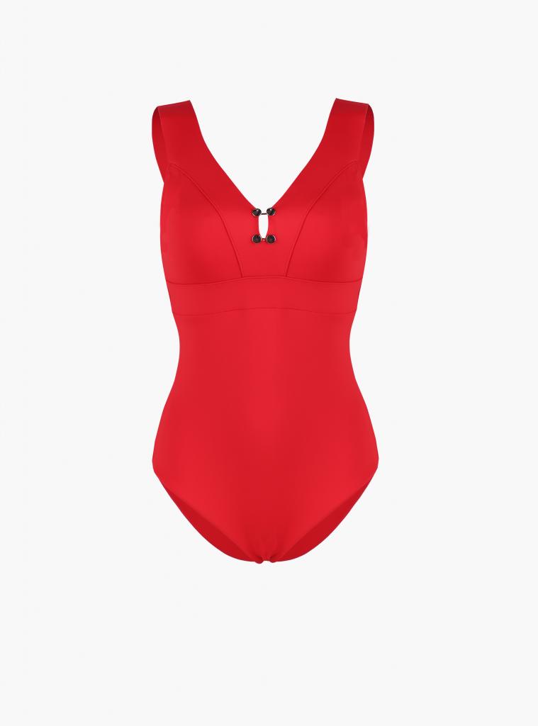 Слитный купальник, изготовленный из полиамида и выполненный в красном цвете, плотно облегает тело и не сковывает движения. Внутри имеются треугольные поролоновые съемные чашки без косточек и без Push-Up. В зоне декольте имеется украшение в виде декоративных элементов.