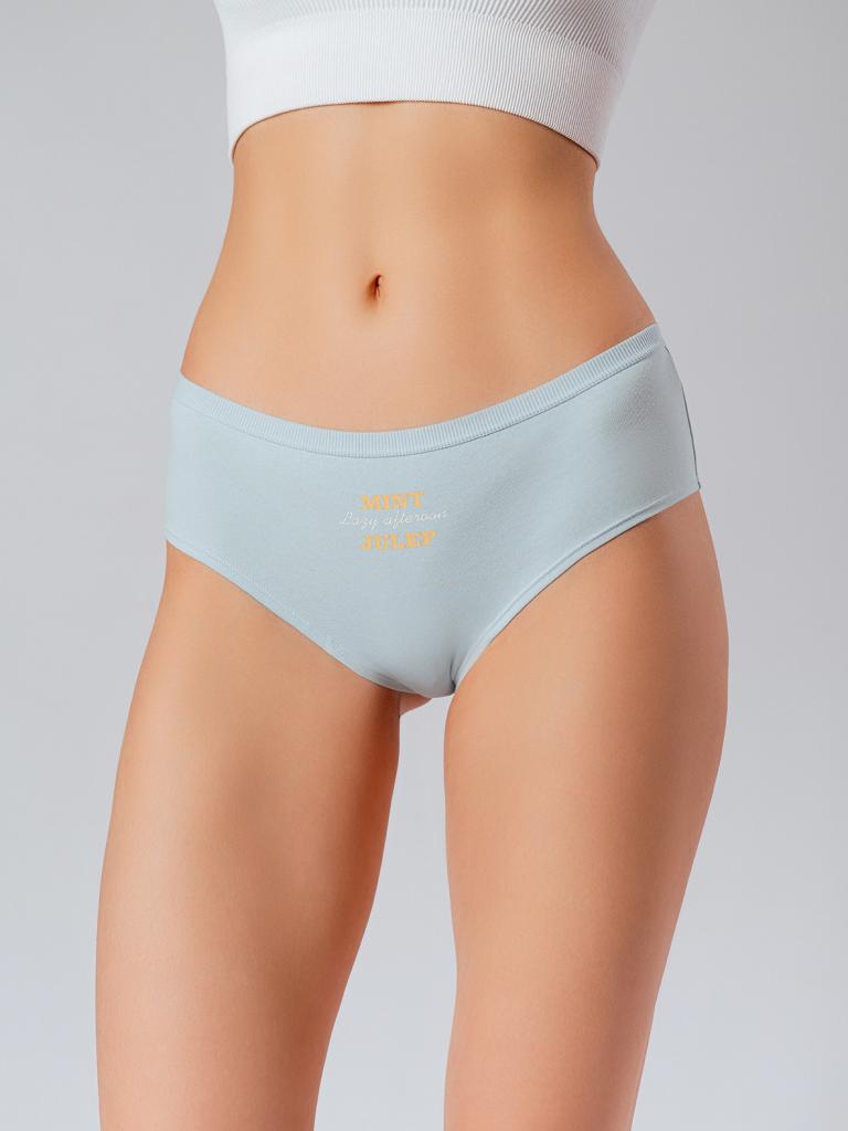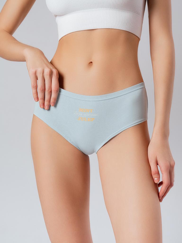 На трусы нанесён принт с надписью «MINT», «Lazy afternoon» и «JULEP» в оранжево-бежевых тонах.