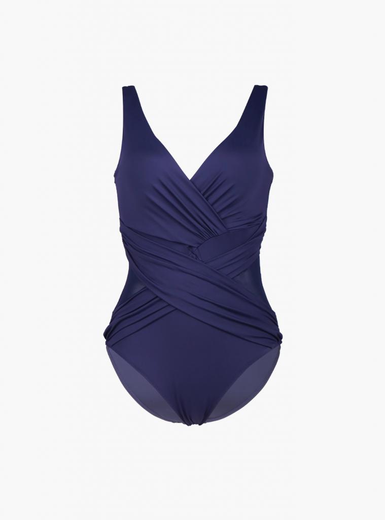 Слитный купальник на тонких бретелях, изготовленный из полиамида, выполнен в темно-синем цвете. Внутри имеются съемные поролоновые чашки без Push-Up. Сетчатые вставки расположена на передней части купальника и на задней части бретелей.