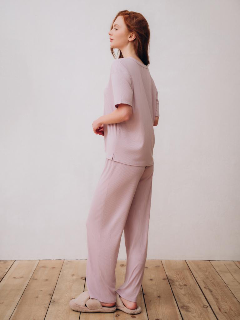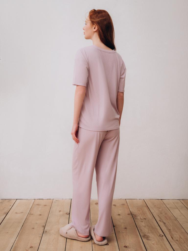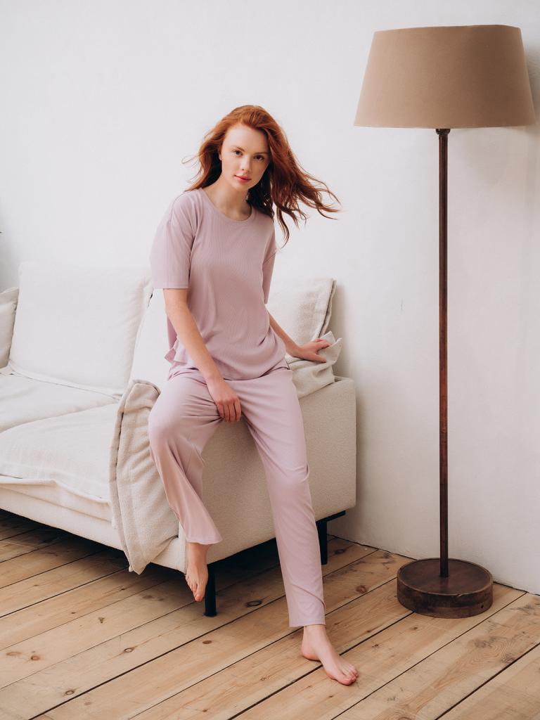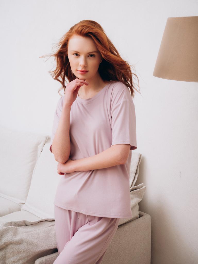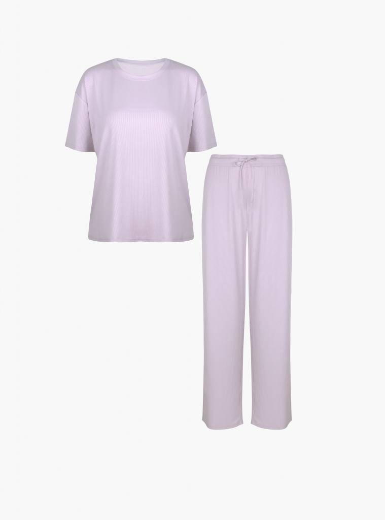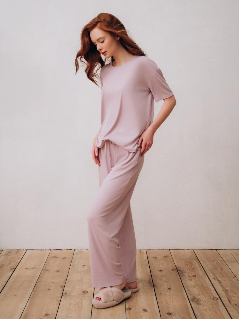 Пижама женская изготовлена из смесового трикотажа и выполнена в сиреневом цвете с фактурой ткани в рубчик. Пижама включает в себя футболку и брюки. Футболка прямого свободного кроя имеет короткие рукава и округлый вырез. Брюки прямого свободного кроя имеют широкую мягкую резинку на талии с регулирующим шнурком внутри.