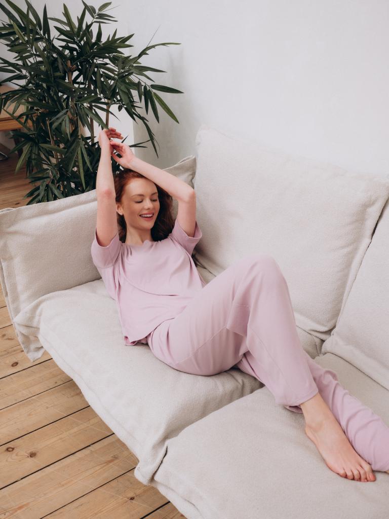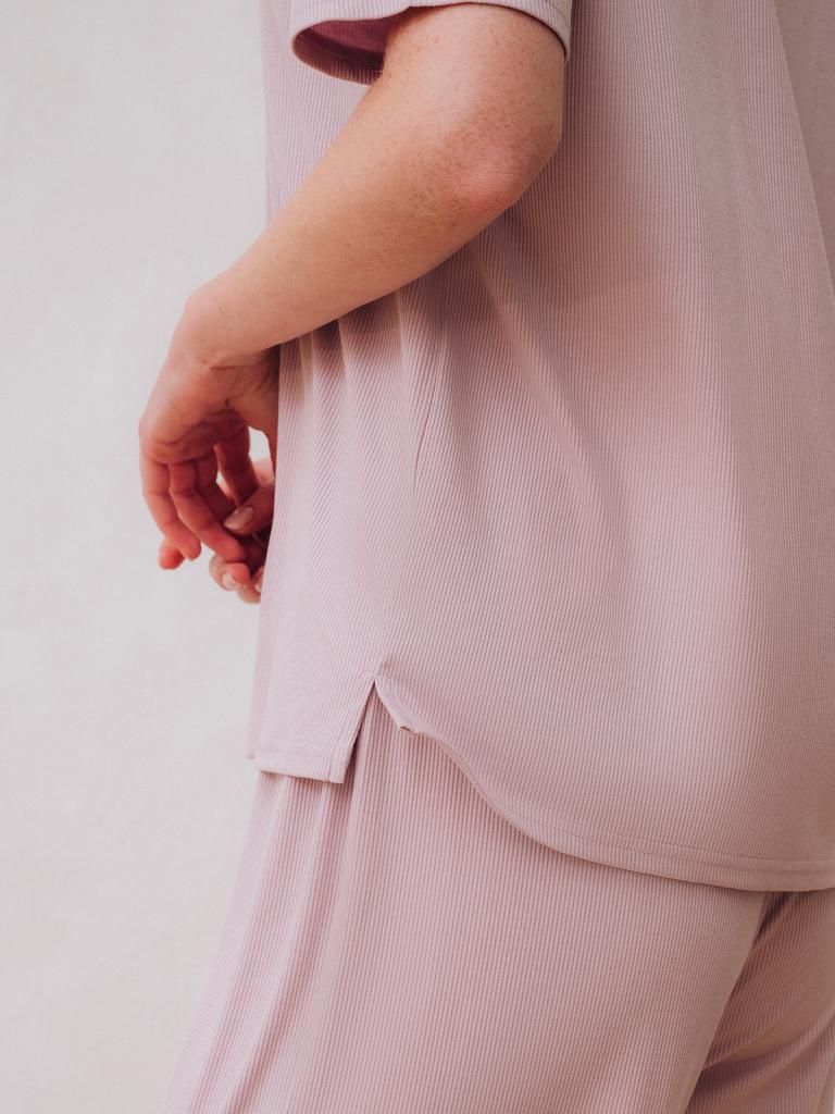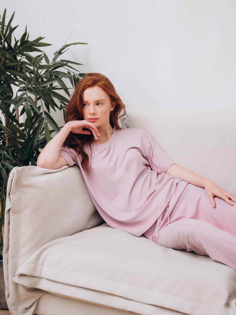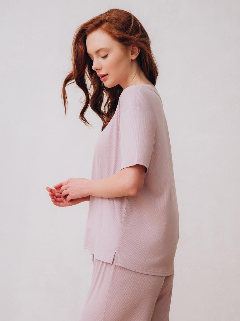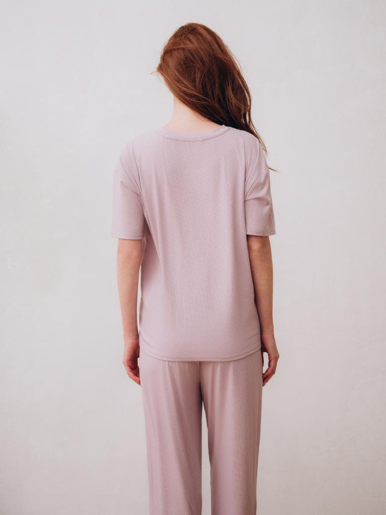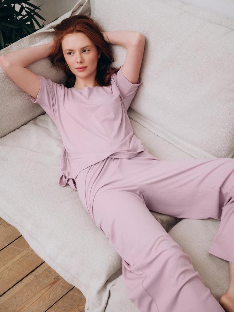 Пижама женская изготовлена из смесового трикотажа и выполнена в сиреневом цвете с фактурой ткани в рубчик. Пижама включает в себя футболку и брюки. Футболка прямого свободного кроя имеет короткие рукава и округлый вырез. Брюки прямого свободного кроя имеют широкую мягкую резинку на талии с регулирующим шнурком внутри.