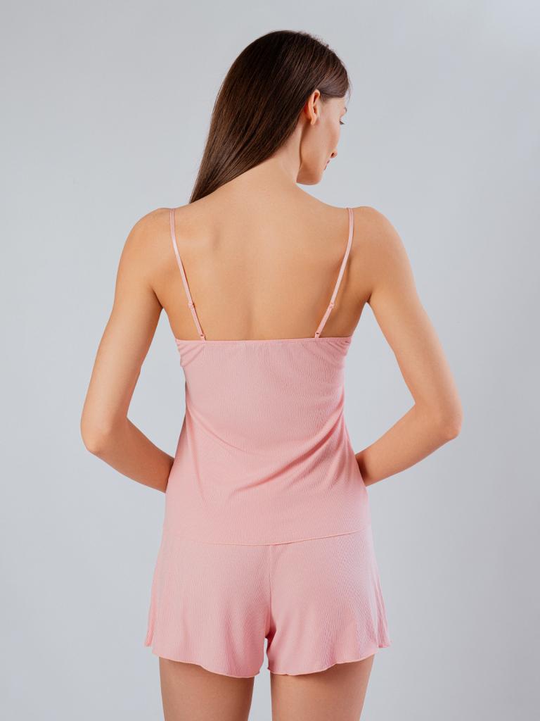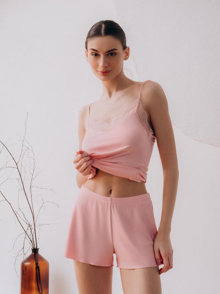 Пижама женская изготовлена из смесового трикотажа и выполнена в розовом цвете с фактурой ткани в рубчик. В пижаму входят майка с шортами. Майка на тонких регулируемых бретелях, верхний вырез спереди обрамлен кружевными узорами. Шорты имеют мягкую эластичную резинку на талии.