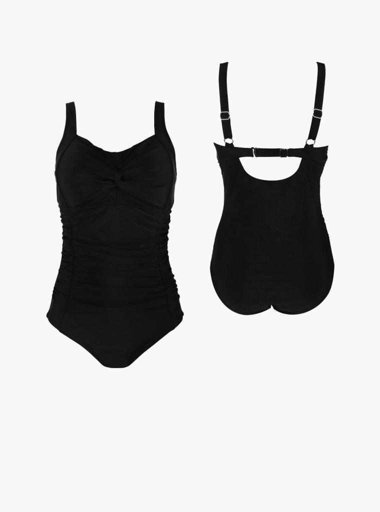 Слитный купальник, изготовленный из полиамида, выполнен в классическом черном цвете. Он плотно облегает фигуру, не сковывая движений. Купальник имеет поролоновые несъемные чашки без эффекта Push-up. Тонкие бретели регулируются, на задней верхней части купальника имеется отстегивающийся регулируемый ремешок.