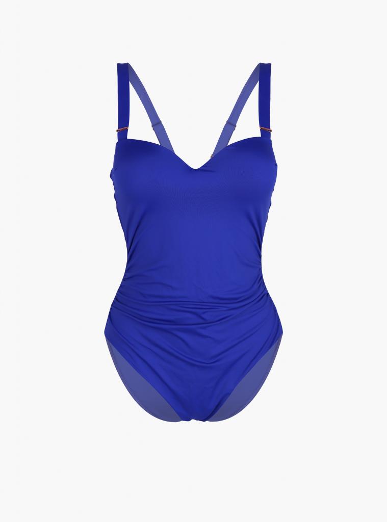 Слитный купальник, изготовленный из полиамида, выполнен в светло-синем цвете. Внутри в области груди имеются поролоновые чашки на косточках без эффекта Push-Up. Тонкие съемные бретели регулируются.