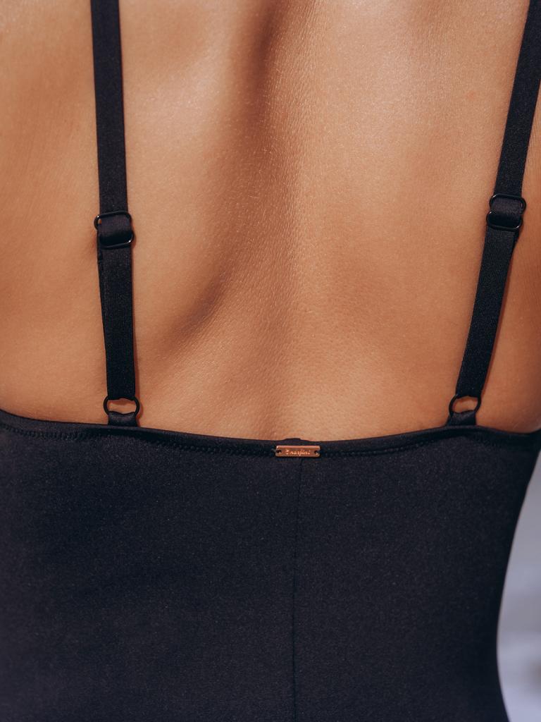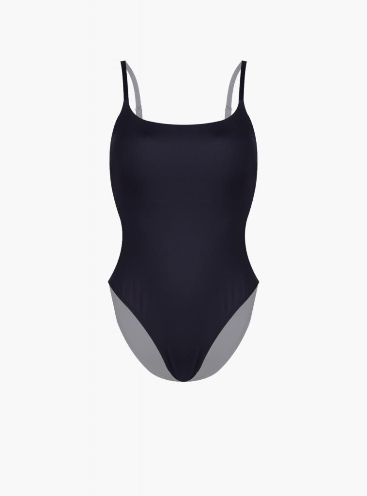 Слитный купальник, изготовленный из полиамида, выполнен в классическом черном цвете. Он плотно облегает тело, не сковывая движений и не вызывая дискомфорта. Внутри в области груди имеются съемные поролоновые чашки без эффекта Push-Up. Тонкие бретели регулируются.