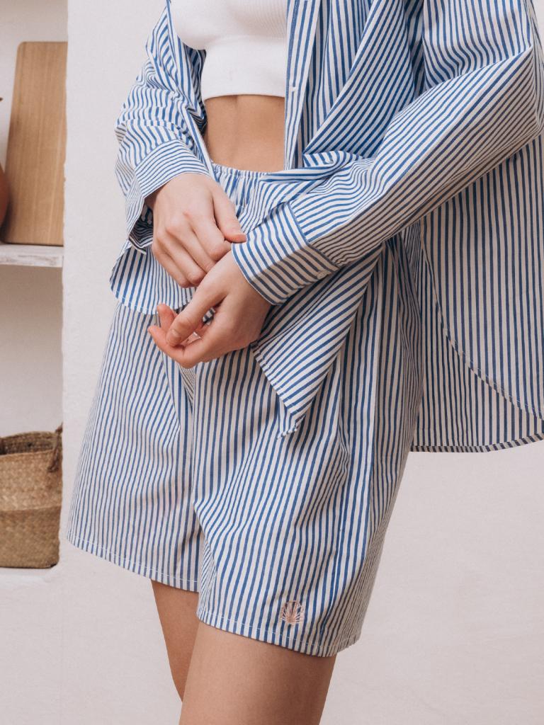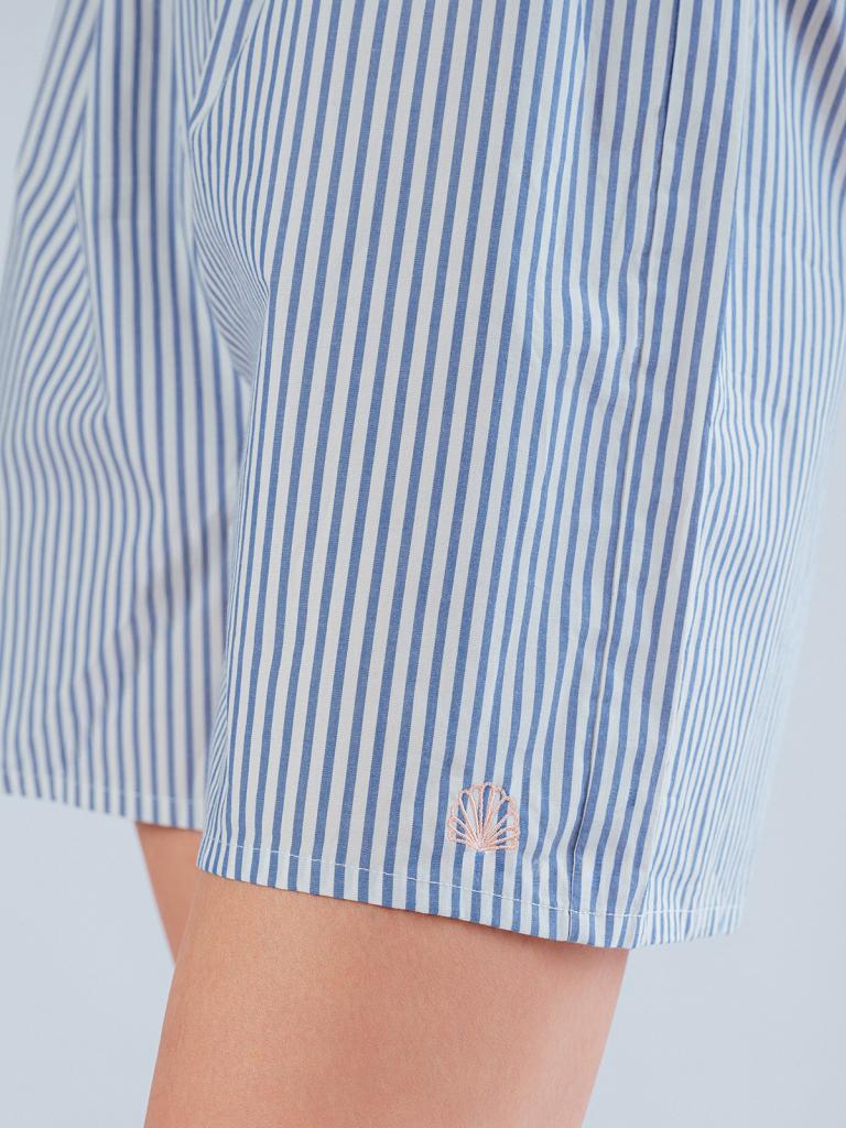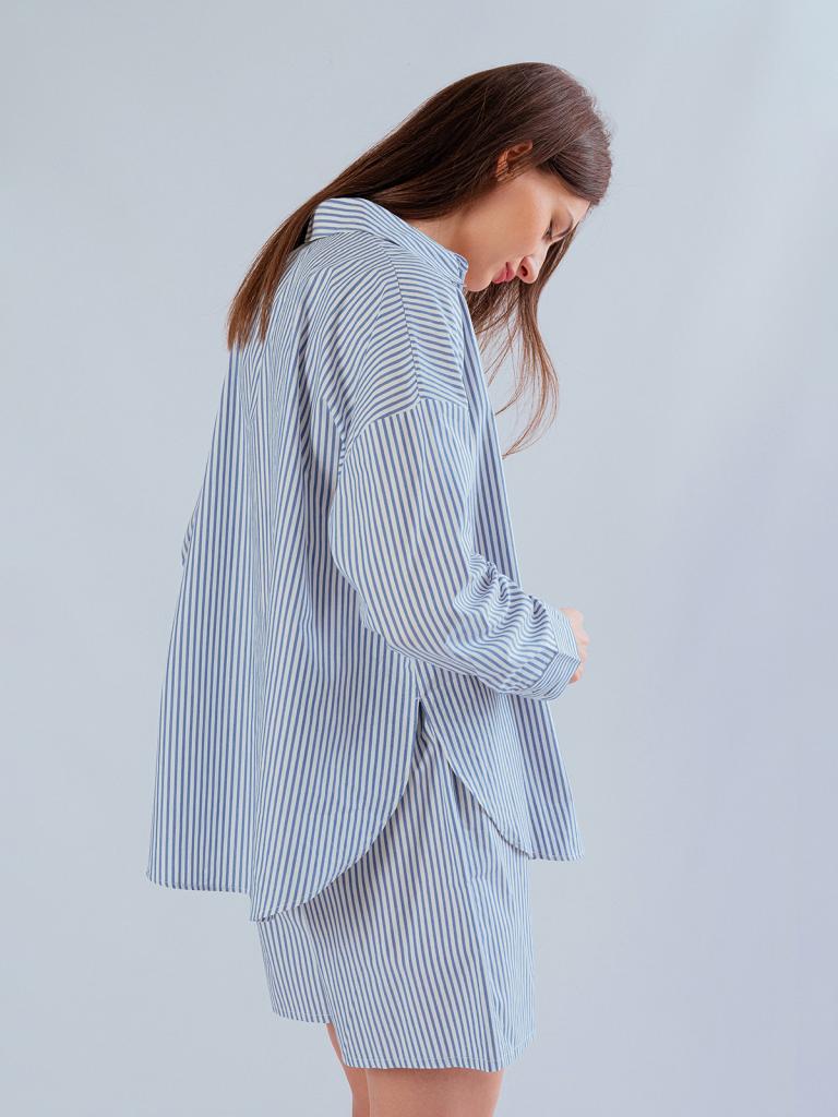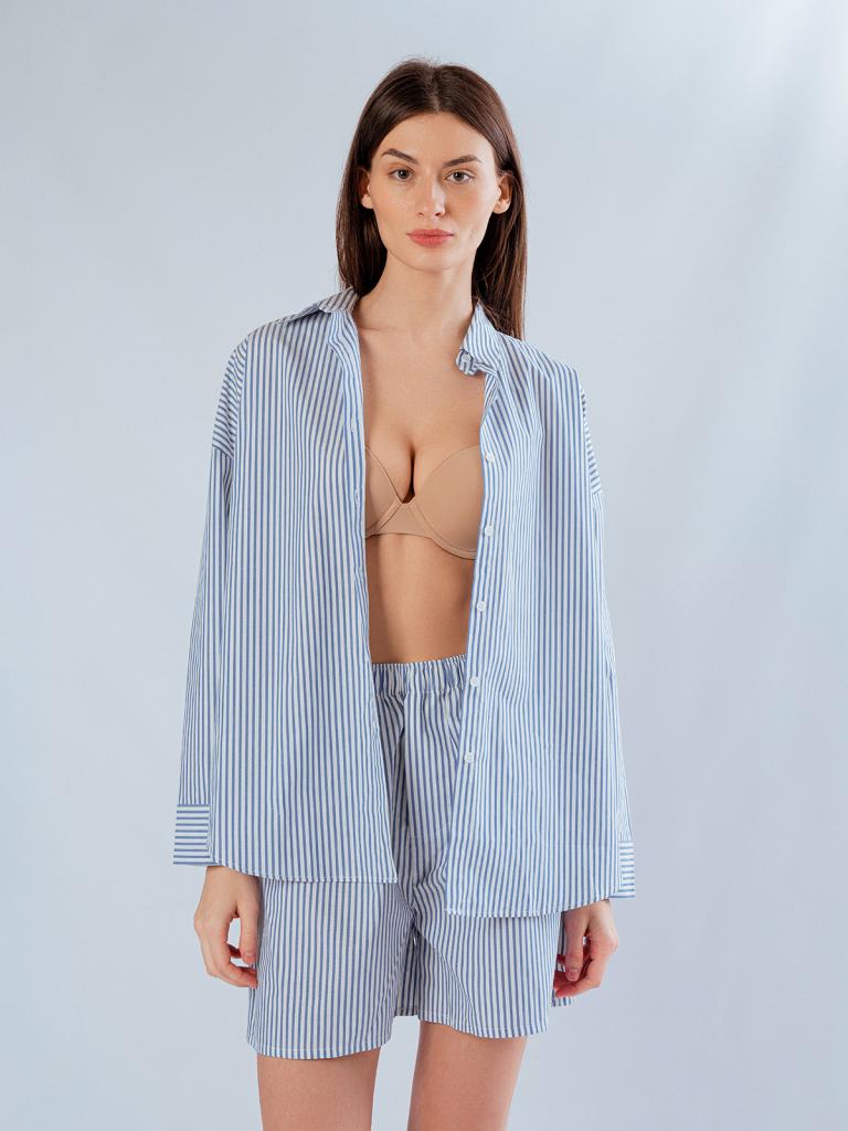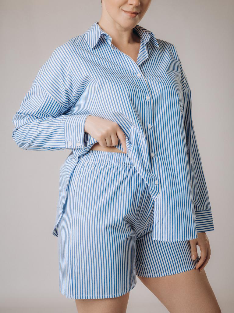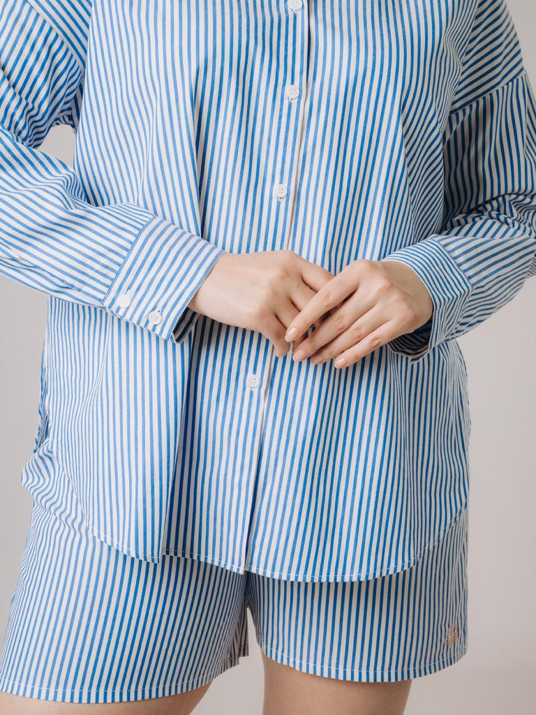Пижама женская, изготовленная из хлопковой ткани, выполнена с принтом в сине-белую полоску. Она состоит из рубашки и шорт. Рубашка прямого кроя на пуговицах имеет длинные рукава и отложной воротник. Шорты имеют мягкую широкую резинку на талии. На нижней боковой части шорт имеется декоративная вышивка в виде ракушки.