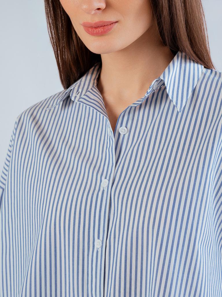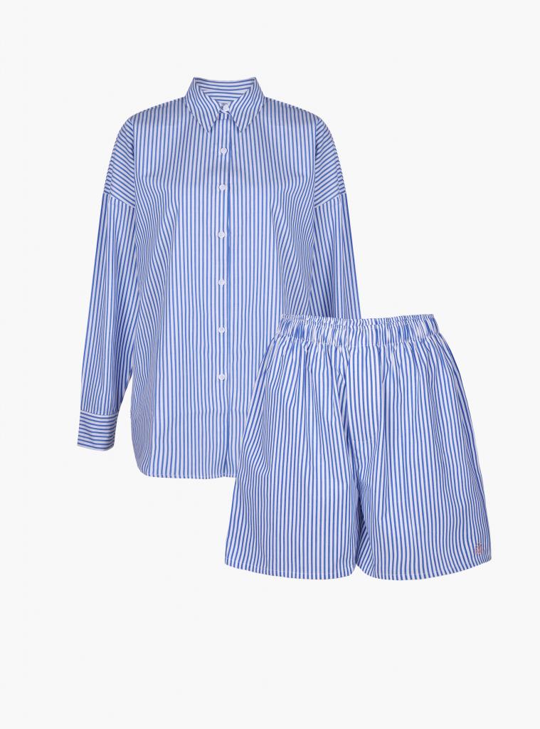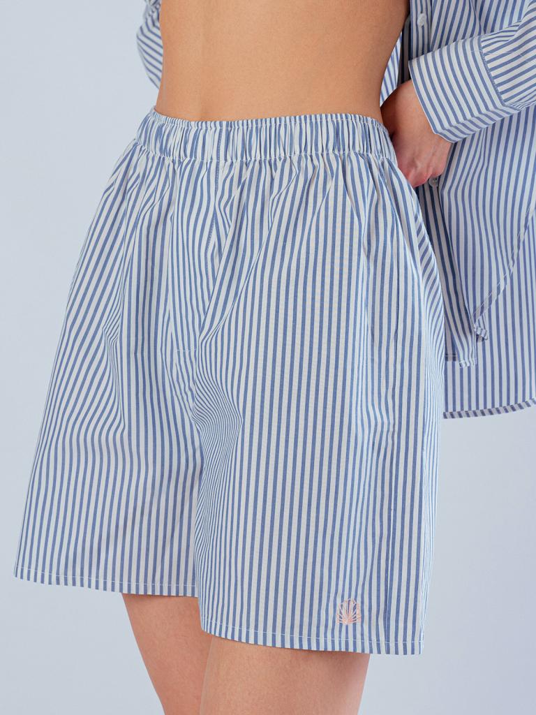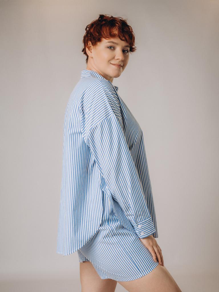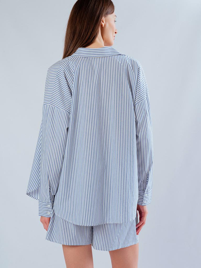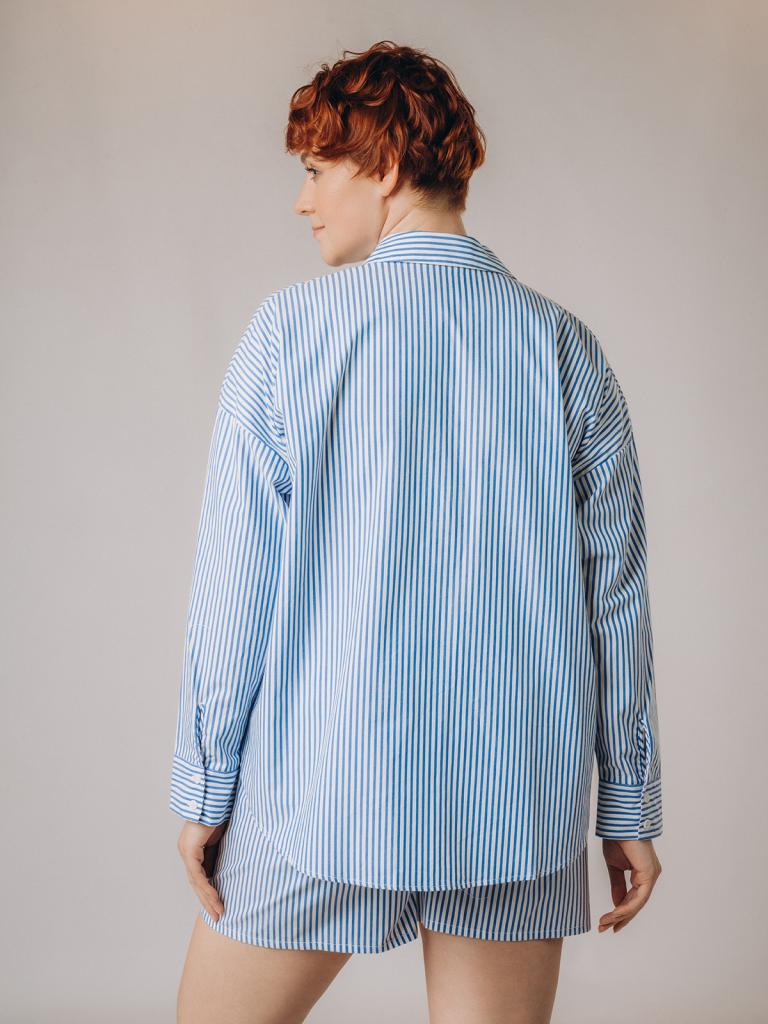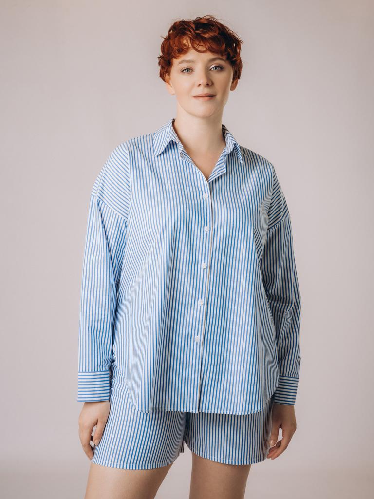 Пижама женская, изготовленная из хлопковой ткани, выполнена с принтом в сине-белую полоску. Она состоит из рубашки и шорт. Рубашка прямого кроя на пуговицах имеет длинные рукава и отложной воротник. Шорты имеют мягкую широкую резинку на талии. На нижней боковой части шорт имеется декоративная вышивка в виде ракушки.