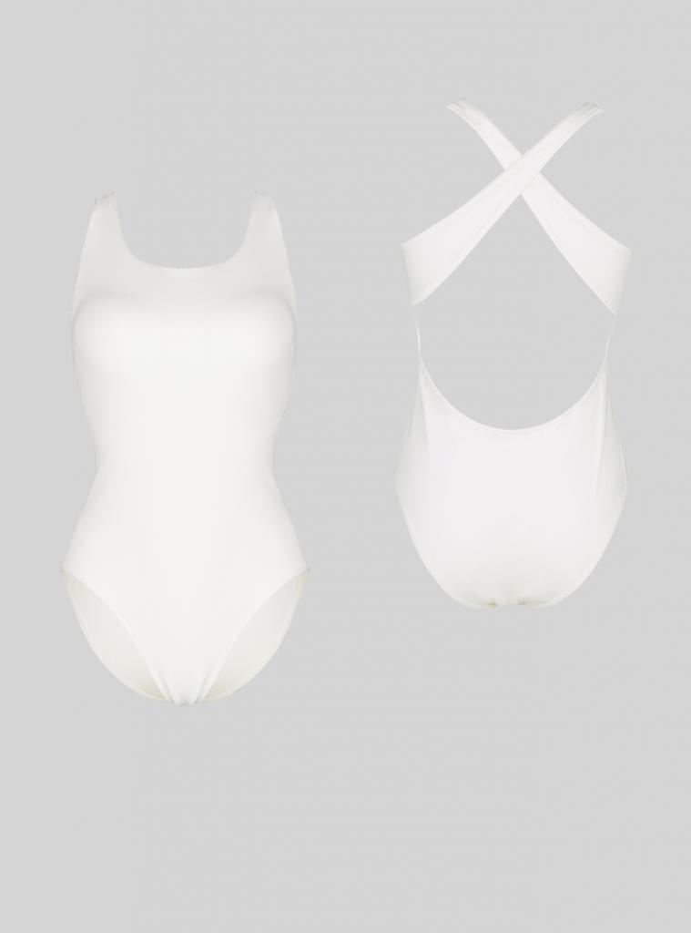 Слитный купальник изготовлен из полиамида и выполнен в классическом белом цвете с фактурной тканью и округлым вырезом на спине. Внутри имеются поролоновые чашки без Push-Up. Широкие бретели сзади носятся крест-накрест.