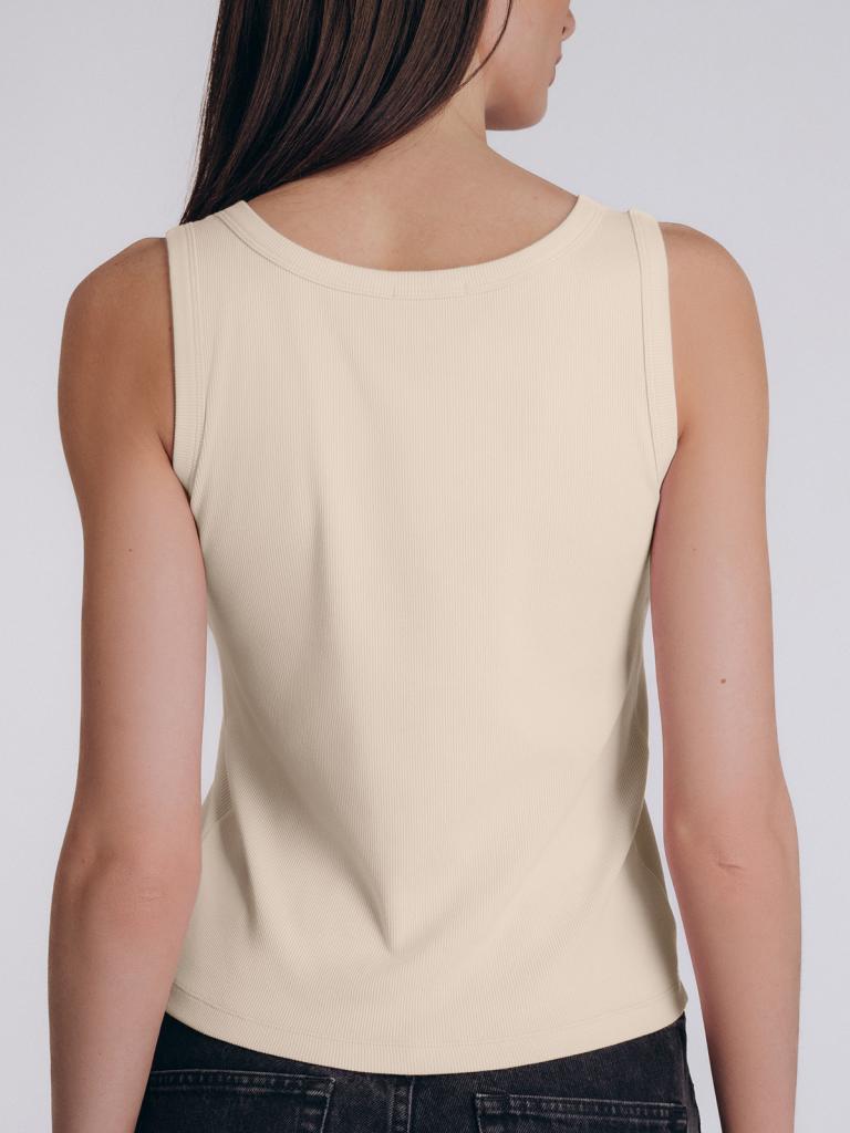 Белая майка классического кроя из хлопково-вискозного полотна с тонкой рубчатой текстурой.