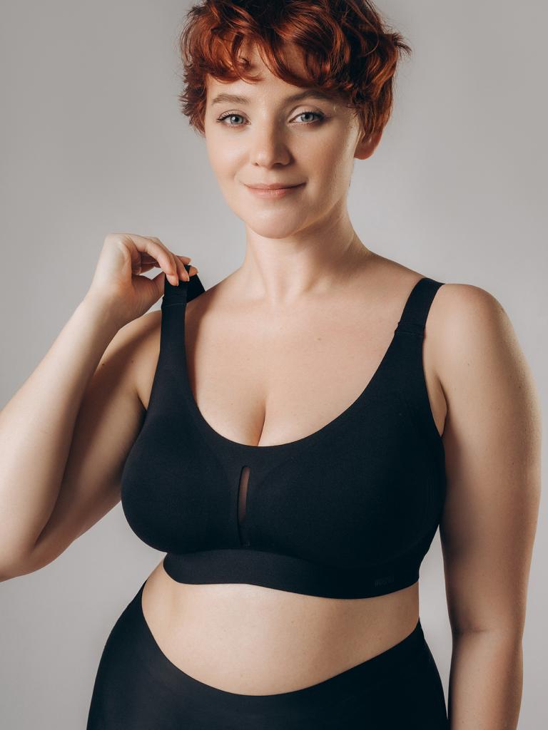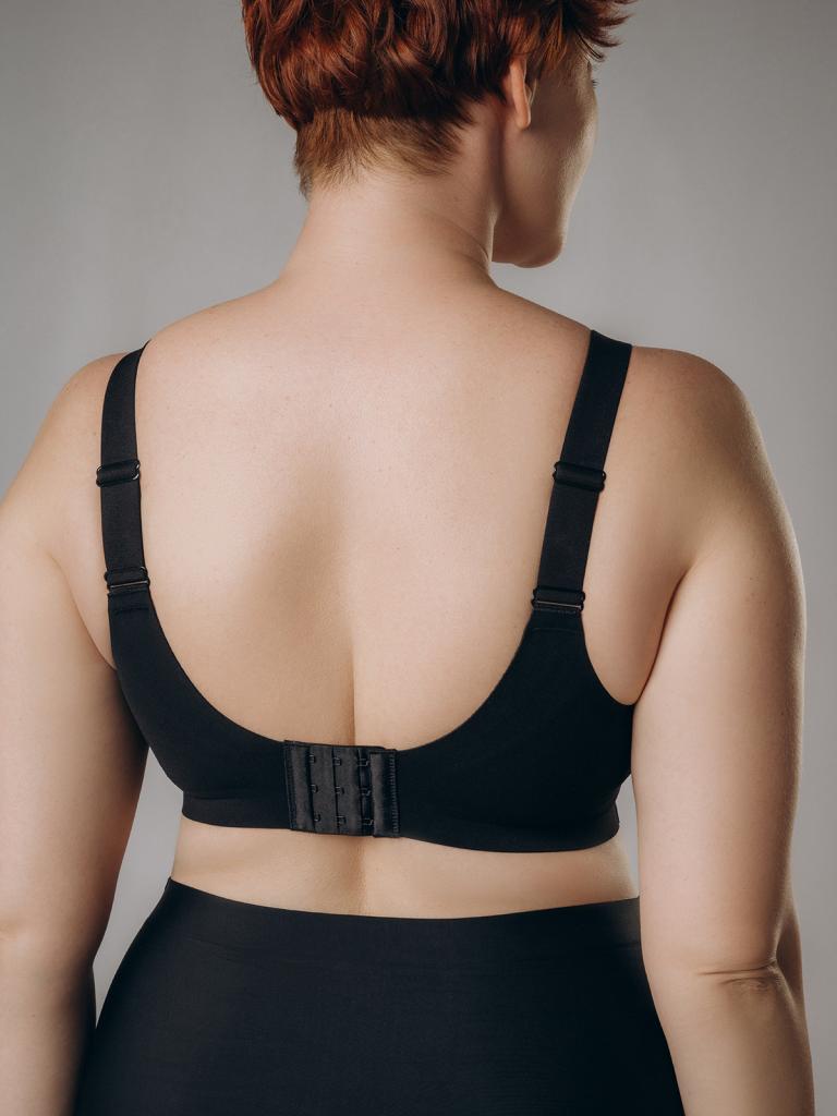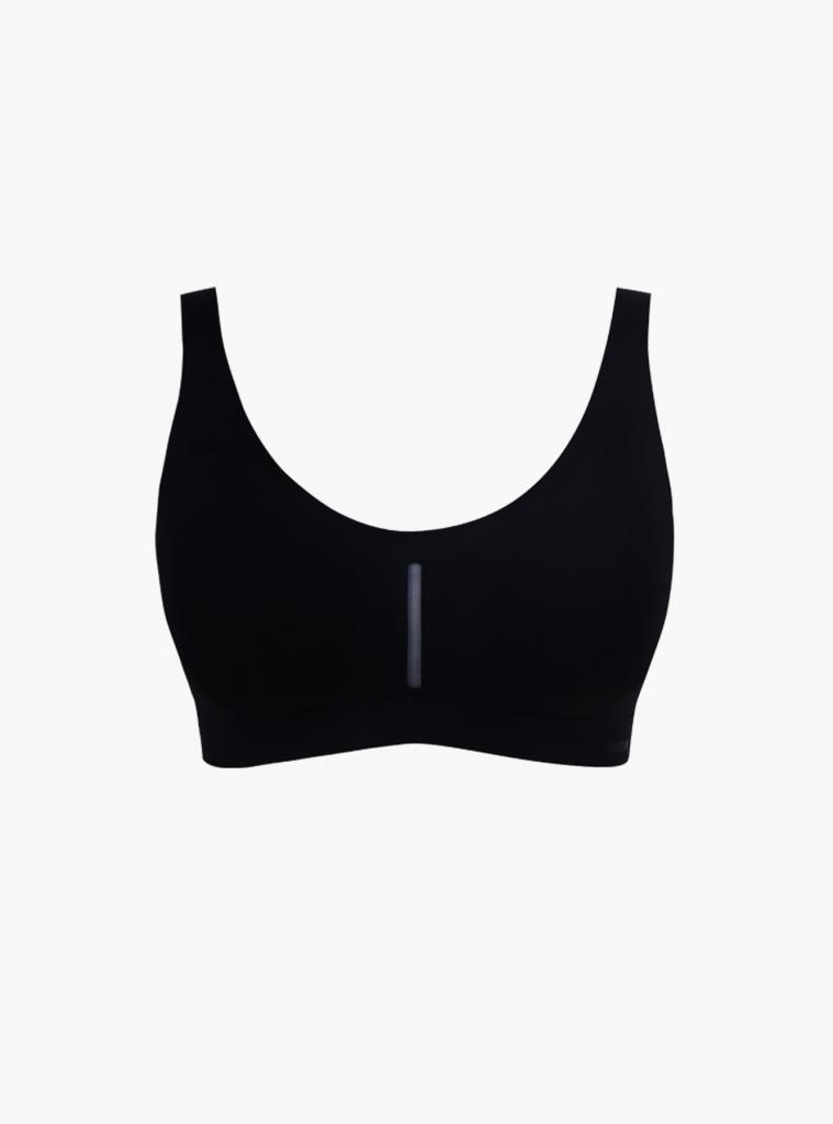 Бесшовный бюстгальтер, изготовленный из полиамида, выполнен в классическом черном цвете. Поролоновые съемные чашки не имеют дополнительную поддержку груди. Между чашками имеется тонкая вертикальная сетчатая вставка. Широкие бретели регулируются. Бесшовный бюстгальтер застёгивается на крючки сзади.