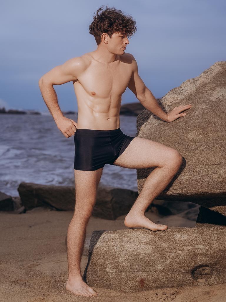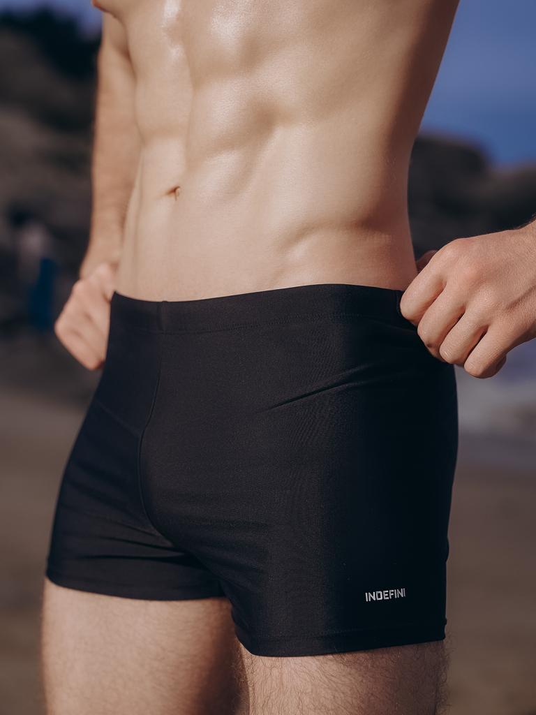 Мужские плавки, изготовленные из полиамида, выполнены в классическом черном цвете. Они плотно прилегают к телу, не стесняя движений. На талии имеется мягкая широкая резинка с регулирующим шнурком внутри. Сбоку на нижней части плавки украшены надписью «INDEFINI».