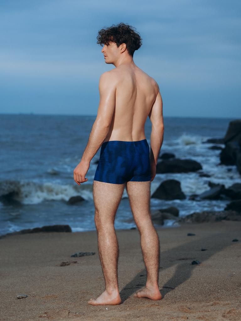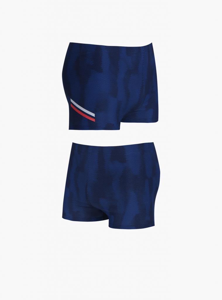 Мужские плавки, изготовленные из полиамида, выполнены в синем цвете. На внутренней части плавок имеется подкладка с двумя нижними вырезами. На талии широкая эластичная резинка с регулирующим шнурком внутри. Сбоку плавки украшены красной и белой полосками.