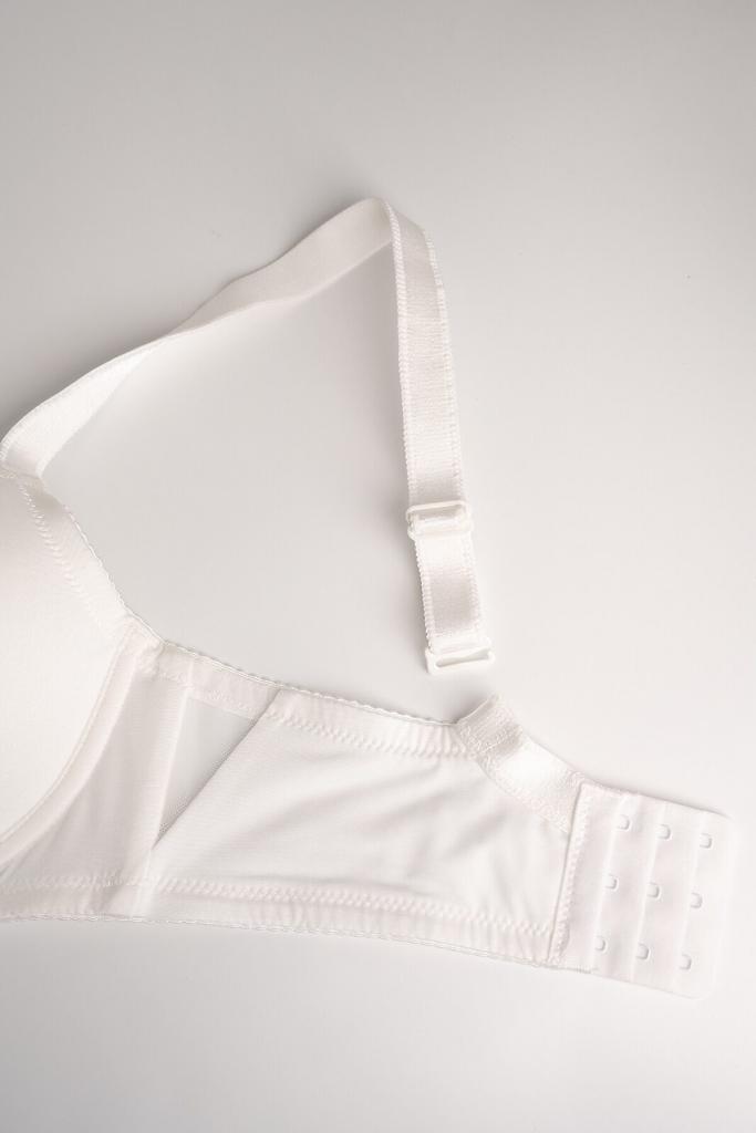 Элегантный женский бюстгальтер белого цвета с изысканным украшением из бижутерного сплава на передней части. Модель оснащена широким рядом крючков, что обеспечивает надежную фиксацию и комфорт при носке. Уникальная конструкция с сетчатыми вставками под руками и между грудью создает дополнительную вентиляцию и легкость. Этот бюстгальтер идеально подойдет для повседневного использования, подчеркивая вашу женственность и комфорт.