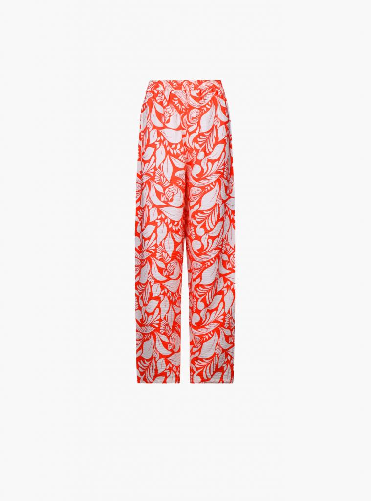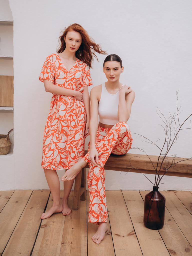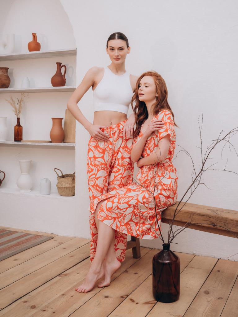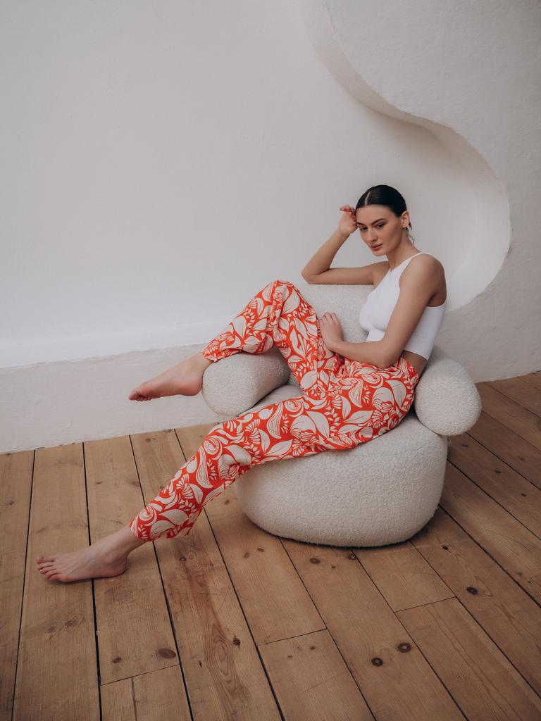 Женские домашние брюки изготовлены из смесовой ткани и выполнены в оранжевом цвете. Брюки прямого свободного кроя держатся на талии мягкой широкой резинкой. На брюки нанесен принт с изображением листьев.