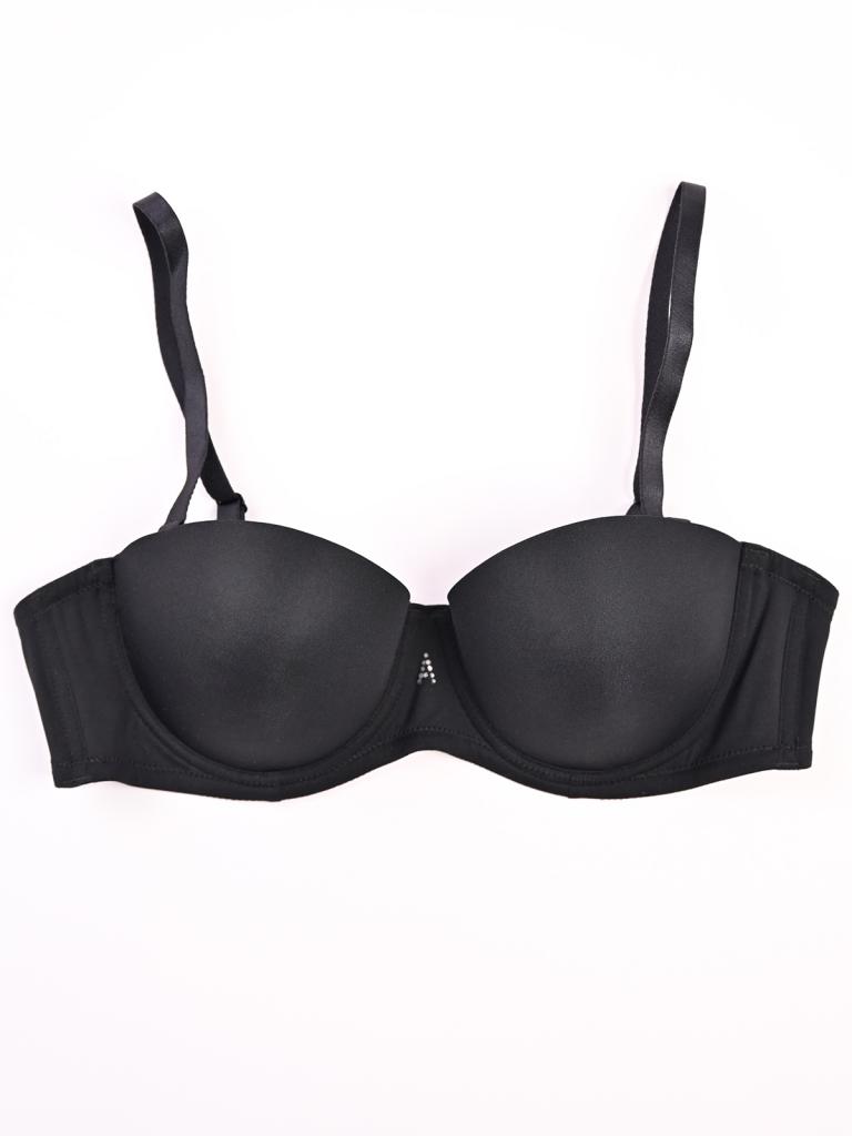 Бюстгальтер черного цвета с эффектом PUSH UP. Поддерживает и приподнимает грудь. Силиконовая лента не дает бюстгальтеру сползать или «гулять» по телу, особенно при активных движениях. Можно носить без бретелей — бюстгальтер держится за счет силиконовых элементов и конструкции чашек.