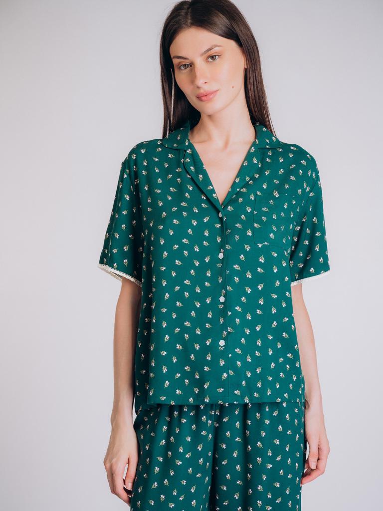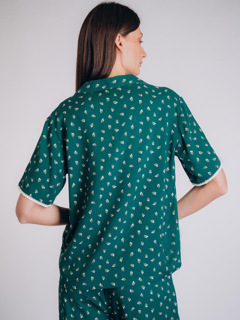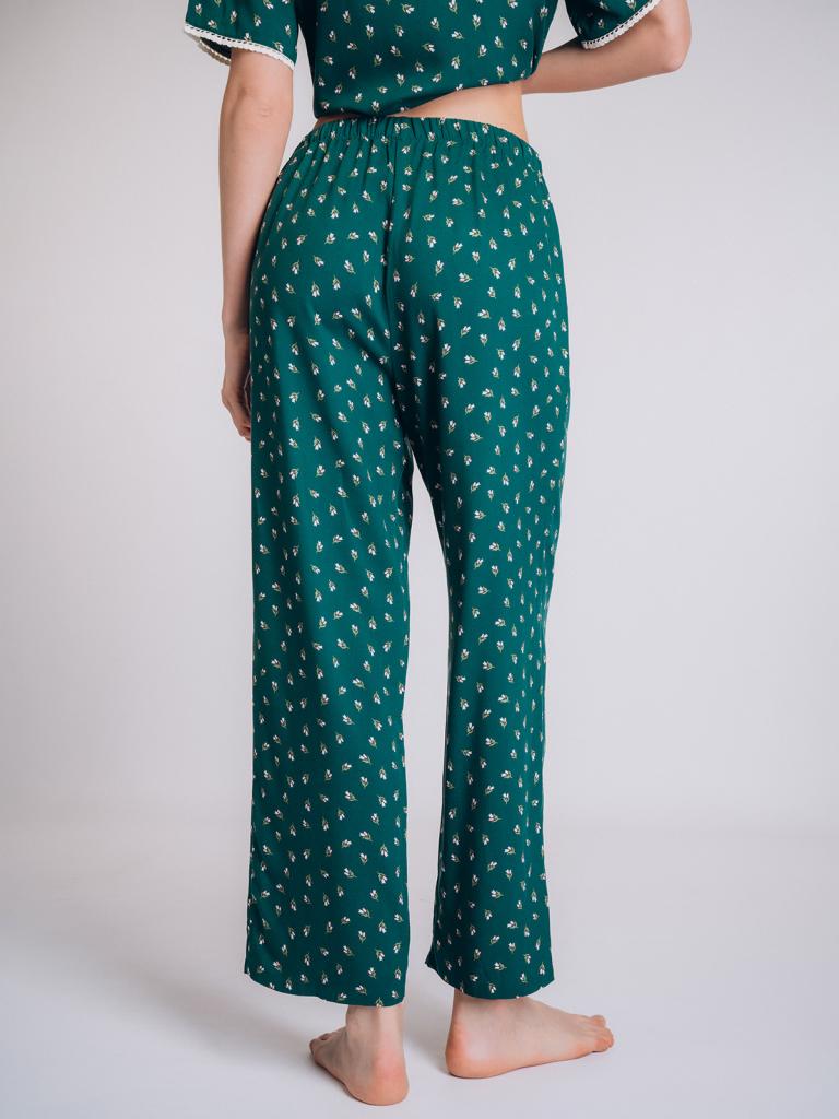 Пижама выполнена из мягкой и приятной на ощупь вискозы с приятным принтом в мелкий цветочный узор, создающий свежий и нежный образ.