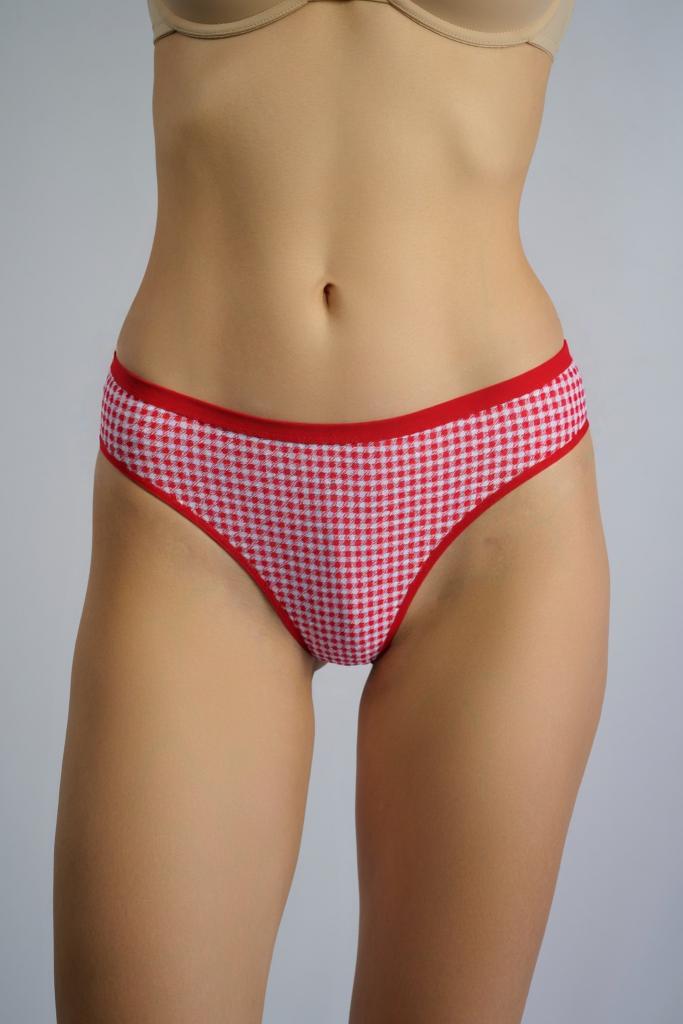 Набор женских трусов-слипов представлен в двух стильных дизайнах: с красно-белым клетчатым принтом и в однотонном бордовом варианте с милым декоративным элементом.