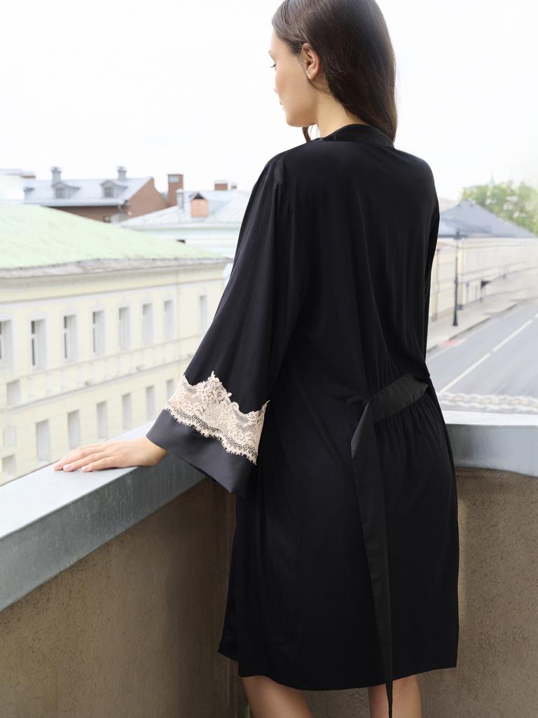 Халат сшит из мягкой вискозы, которая дарит коже приятные ощущения. Халат мягкий и гладкий на ощупь. Его удобно носить как поверх пижамы, так и на голое тело. Рукава украшены кружевом цвета шампанского. Вставки мягкие на ощупь и не колются. Съемный пояс выполнен из той же вискозы, продет в шлевки по бокам и завязывается спереди узлом или бантом. Идеально сочетается с пижамой.