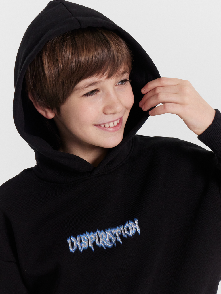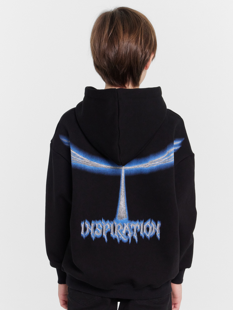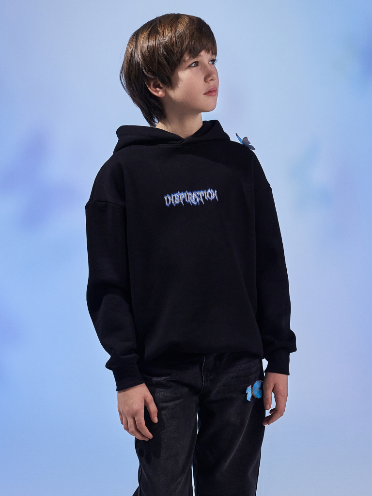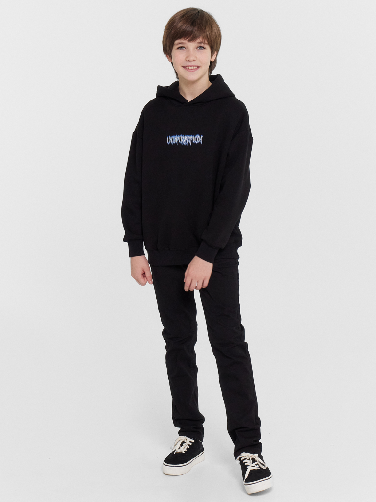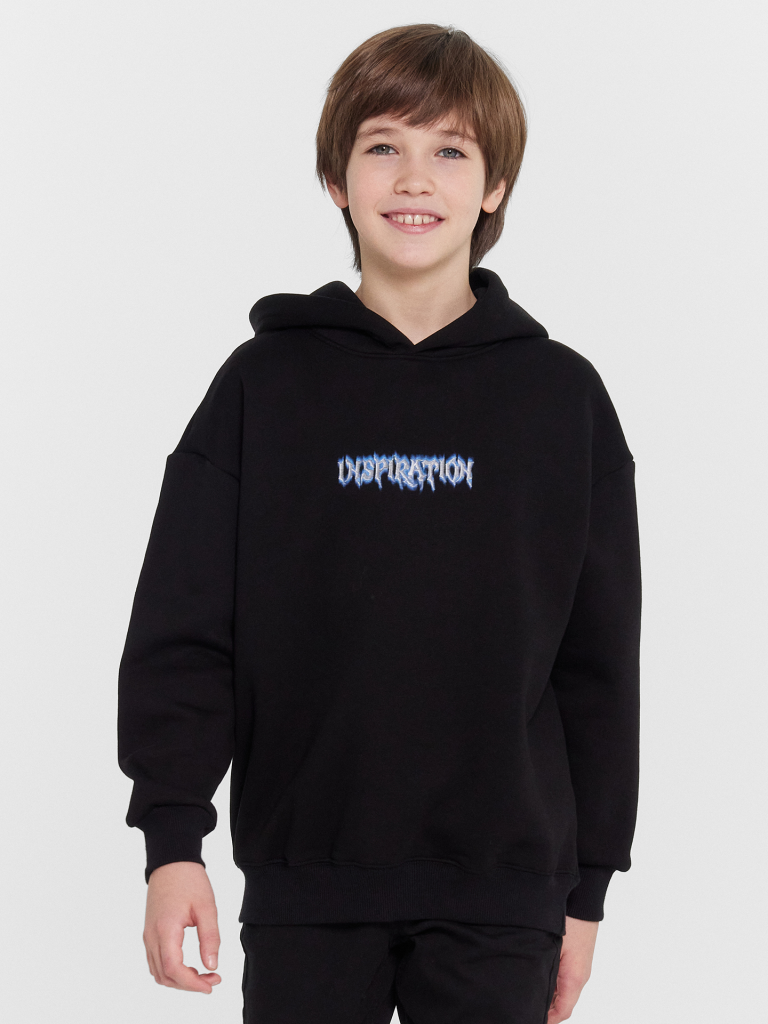 Худи для мальчиков, выполненное из мягкого футера с подчесом. Модель свободного кроя с капюшоном и длинными рукавами обеспечивает максимальный комфорт и уют в прохладные дни. Капюшон добавляет дополнительную защиту от холода, а спущенная линия плеча и эластичные манжеты по низу рукавов создают стильный акцент и удобство. Спереди карман кенгуру, который добавляет функциональности и стиля. Это худи станет отличным выбором для активного отдыха и повседневного ношения, сочетая в себе стиль и практичность.