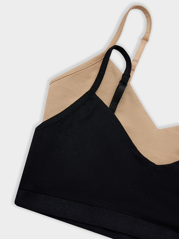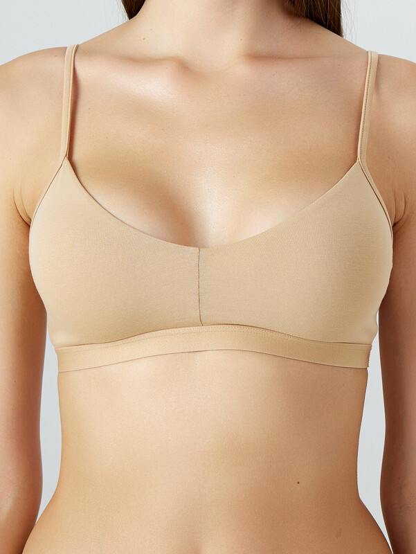Верхний срез спинки и проймы, окантованы бейками из основного полотна, внутри бейки стоит эл тесьма 6 мм (жилка тканая Wt4-6. девсел 13460 W). Окантовка проймы переходит в бретель, по спинке с надставкой из бретельной тесьмы 8 мм (SWE2-8, девсел 1879W), с регулировкой по длине. Кольца-регуляторы пластиковые 8 мм.
