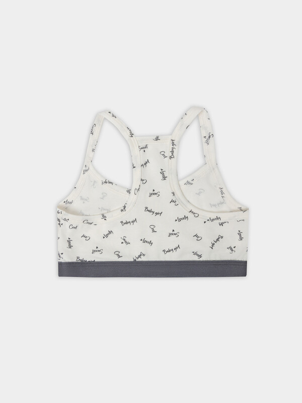 Все срезы топа аккуратно окантованы бейкой из основного полотна, что предотвращает растяжение. По нижнему срезу настрочена жаккардовая эластичная тесьма, которая мягко фиксирует изделие, не оставляя следов на коже. Топ украшен надписями на английском языке: "cool" (крутая), "sweet" (милая), "lovely" (прелестная), "baby girl" (малышка). Эти позитивные фразы добавляют образу игривости и индивидуальности.