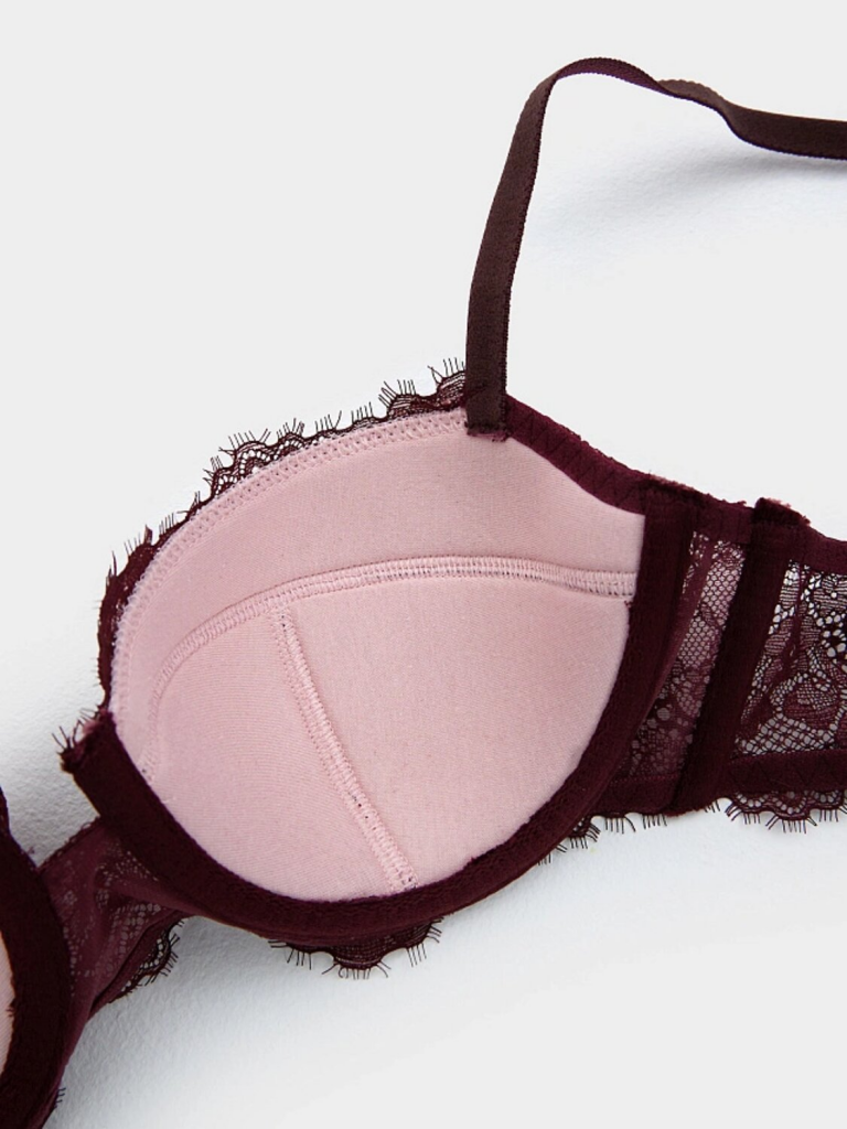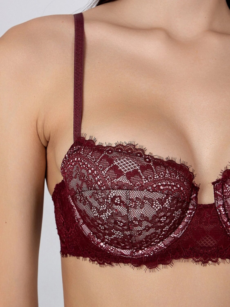 Женский бюстгальтер в стиле балконет с мягкими чашками анатомической формы обеспечивает комфортную поддержку и подчеркивает линию декольте. Нежное эластичное кружево мягко облегает тело, а дышащая подкладка гарантирует удобство при длительной носке.