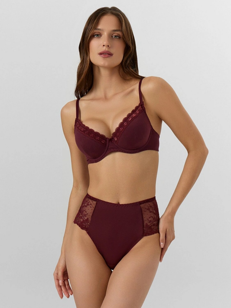 Бюстгальтер тишот на стане, с формованными чашками (СN-53) , на каркасах 2 типа, из кулирного полотна с узким эластичным кружевом. Верхняя чашка выполнена из кулирного полотна с вытачкой, по верхнему срезу декорирована эластичным кружевом шир 3,4 см (код L120-3.4, 81% полиамид; 19% эластан, Антик Дантель арт. 4063). Кружево настрочено на просвет , с оформлением выступа по эластичной тесьме относительно формованной чашки по пройме.