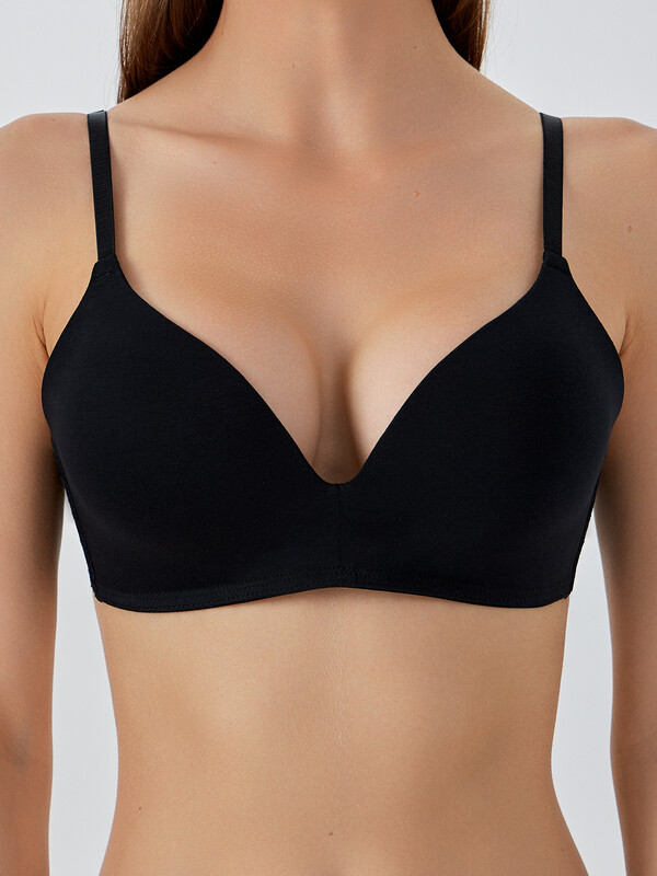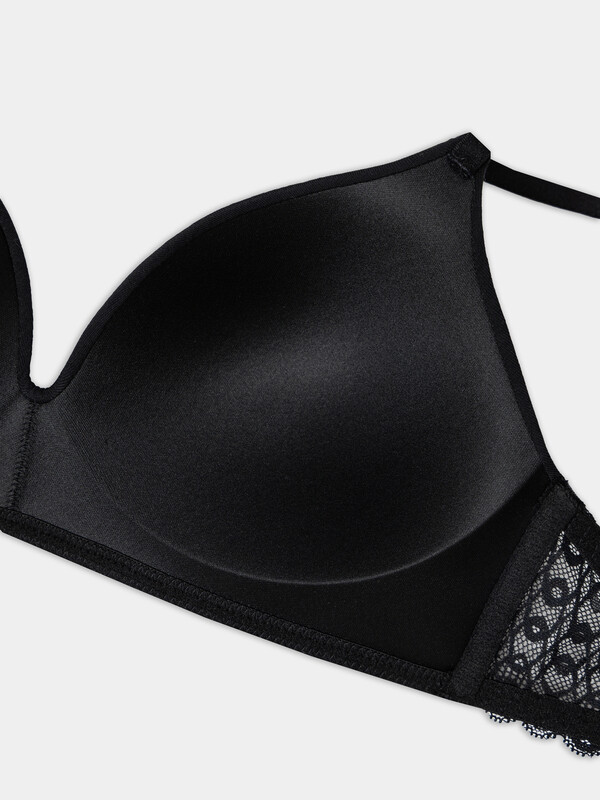 Черный бюстгальтер T-Shirt — идеальная модель для повседневной носки. Чашки формованные, без косточек, сохраняют комфортную форму и обеспечивают плавную поддержку. Боковая часть бюстгальтера сделана из мягкого кружева, которое хорошо тянется. Она плотно, но бережно облегает тело, не создавая давления. Регулируемые бретели и двойная застежка на спине позволяют точно подогнать бюстгальтер по фигуре.