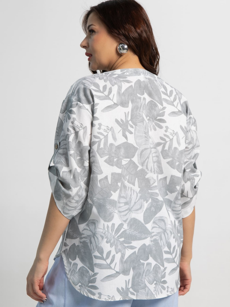 Блузка из натурального материала представлена в бело-сером цвете с принтом в виде листьев. Прямой силуэт модели, с коротким передом и удлиненной задней частью, создает современный и асимметричный образ. Плавный скругленный низ изделия, переходящий к боковым швам, добавляет элегантности и удобства. Укороченный рукав с патой и пуговицей подчеркивает женственность образа. Горловина украшена планкой, которая плавно переходит в застежку на пуговицах, обеспечивая аккуратный и завершенный вид. Эта блузка идеально сочетается с джинсами, юбками или брюками, позволяя создавать стильные и современные образы.