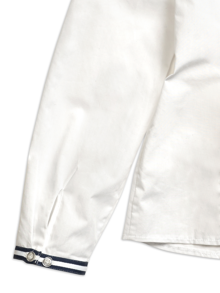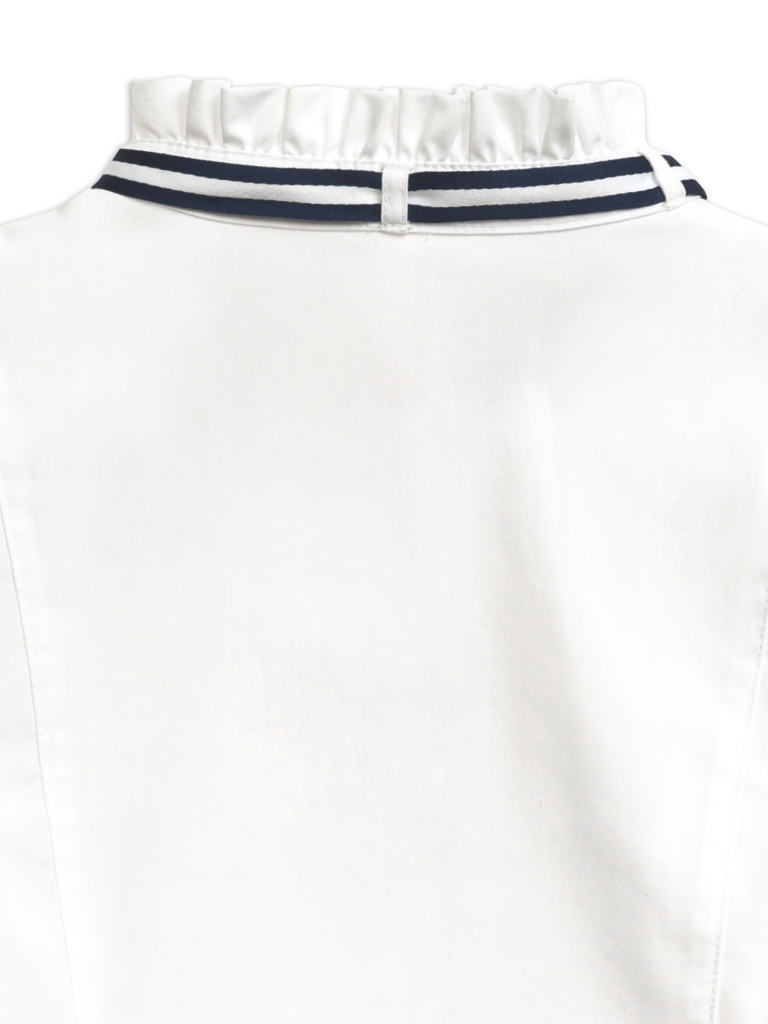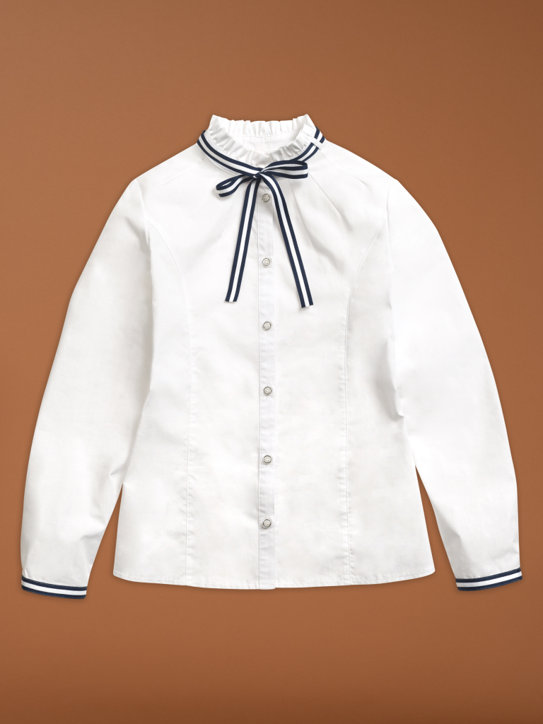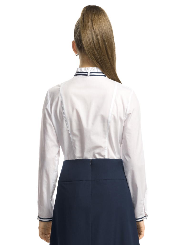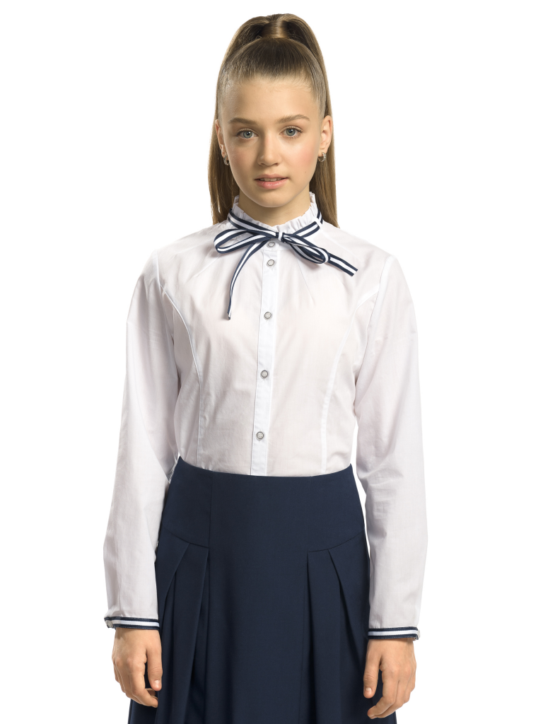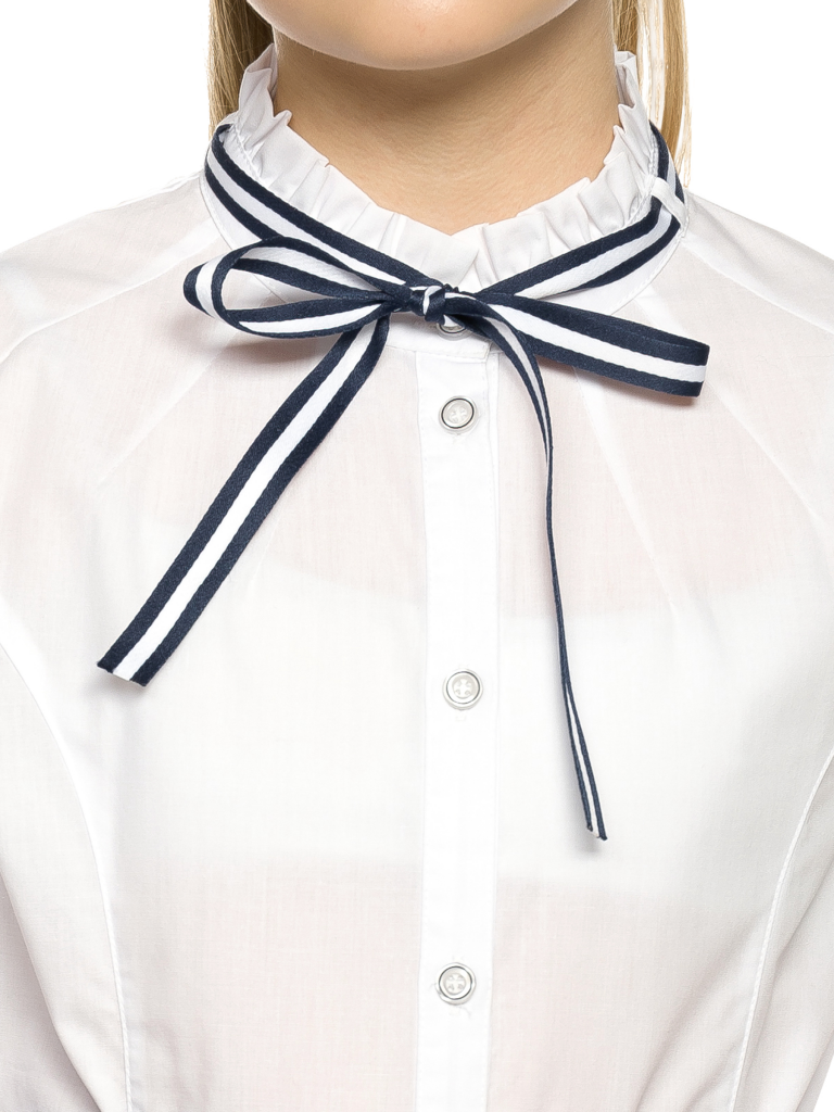 Классика, которая запомнится. Белая рубашка полуприлегающего силуэта имеет яркие акцентные вставки в виде тесьмы на манжетах и съемного декоративного банта под горловиной. Необычное прочтение воротника-стойки с аккуратно-заложенными рюшами удачно дополнено оригинальными лучами-вытачками. Актуальный образ можно сочетать с любым элементом костюма. Изделие подчеркнет характер молодой модницы и избавит мам от головной боли за школьный гардероб.