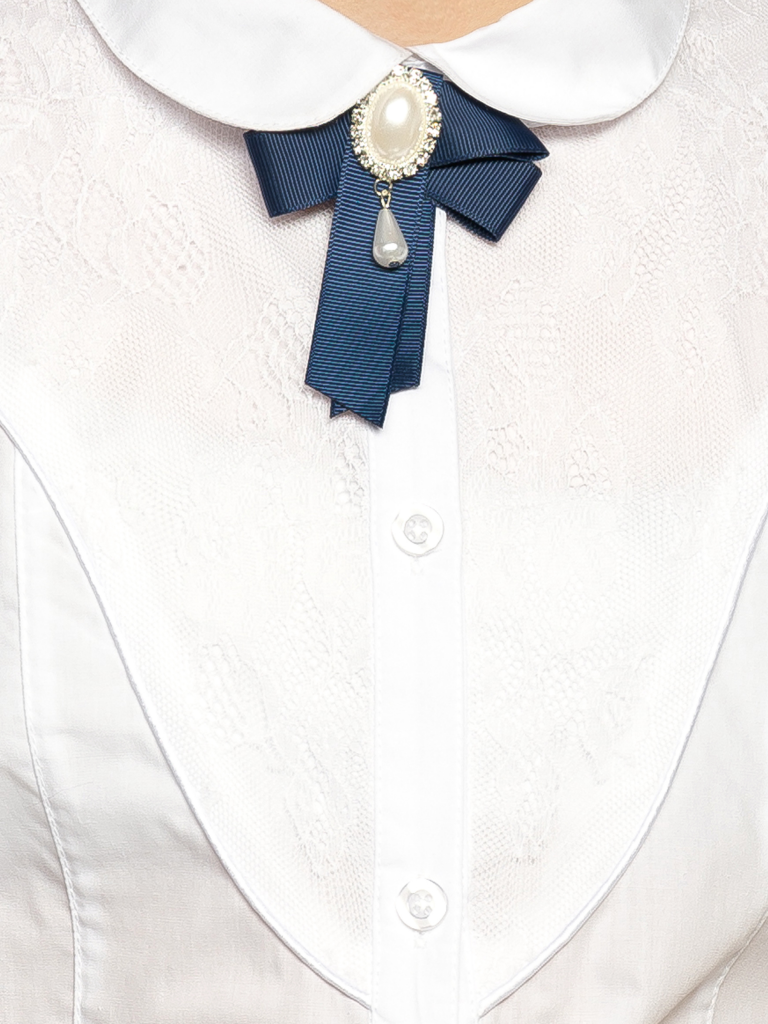 Нестандартная классика для любительниц быть в центре внимания. Эта рубашка приятно удивляет своими нетривиальными формами. Фигурный кружевной декор буквально приковывает взгляды, а съемный бант из темно-синей репсовой тесьмы с декором из жемчуга и страз добавляет образу роскоши и аристократизма. Ну какая модница откажется носить гордое звание иконы стиля?