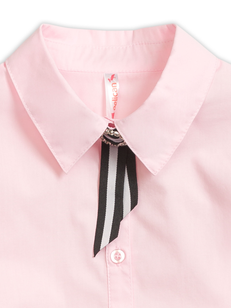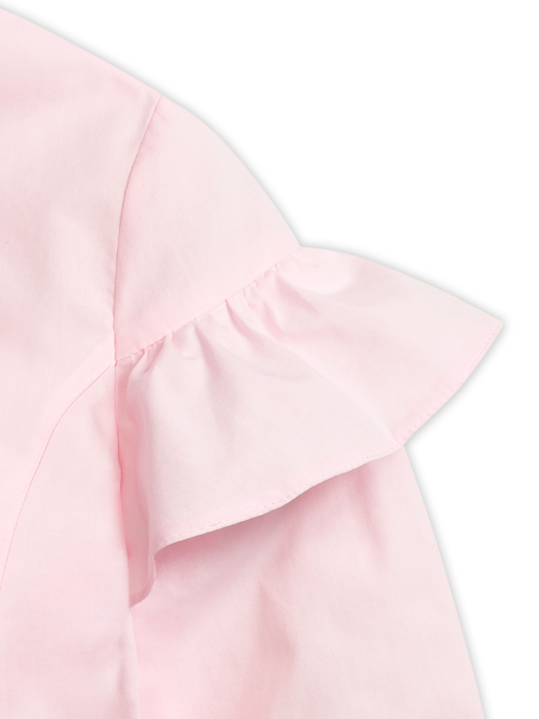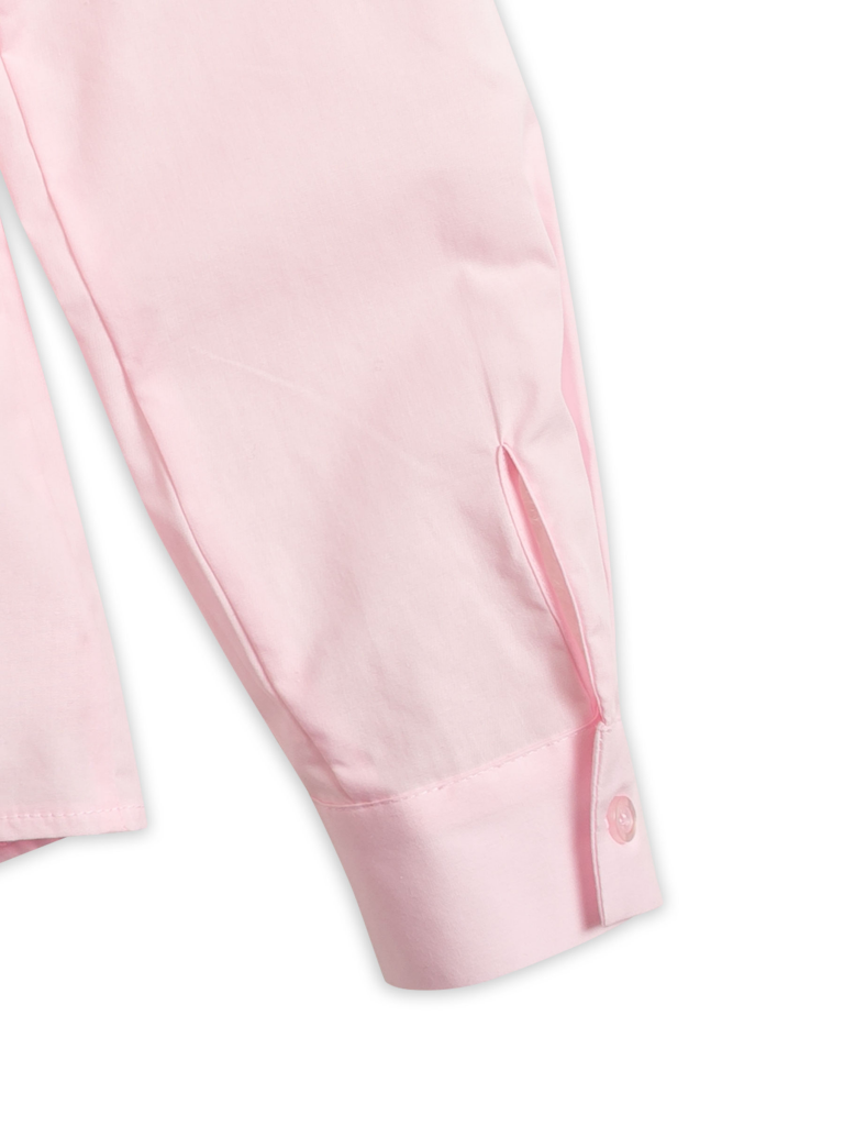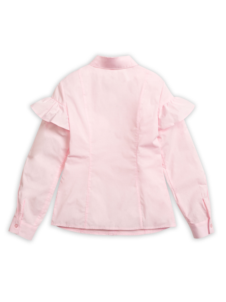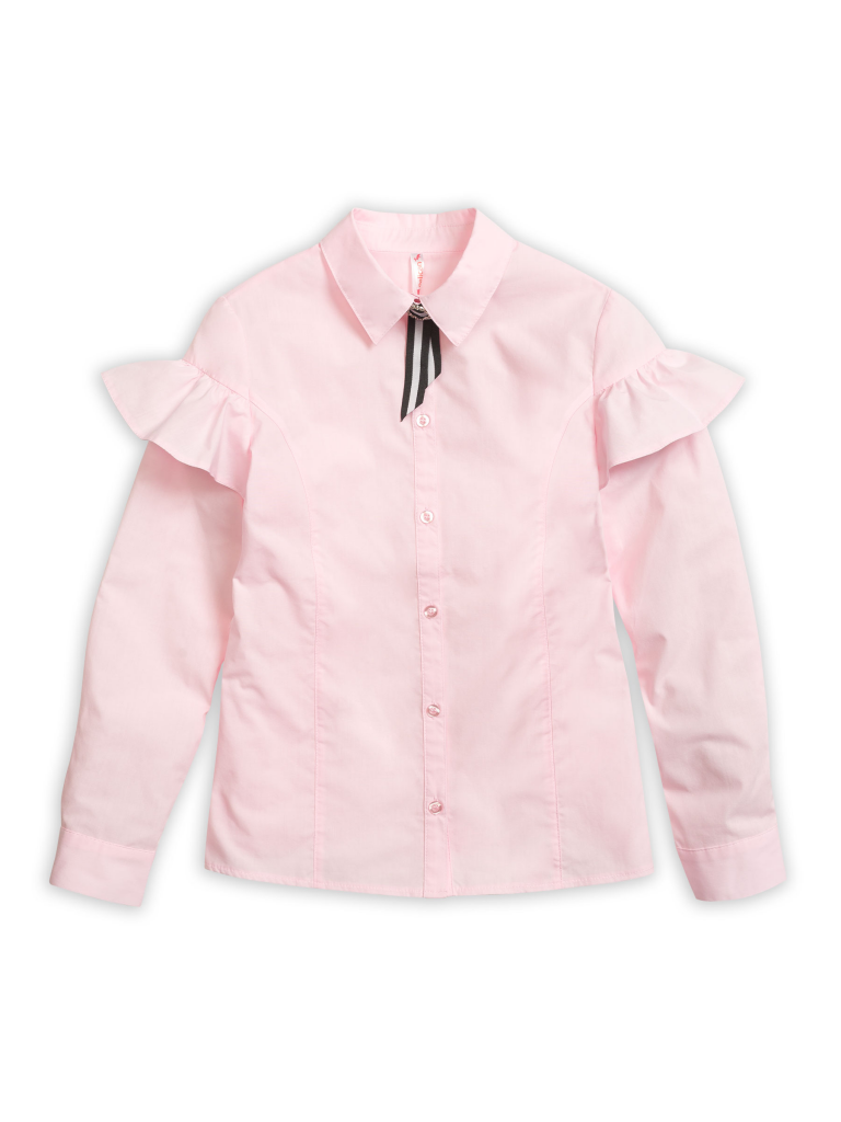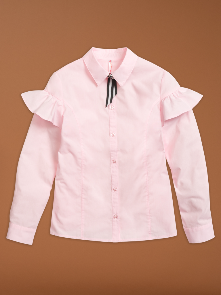 Интересное дизайнерское решение вы найдете в классической рубашке с оригинальным кроем рукавов. На уровне плеч втачены объемные воланы, напоминающие крылья ангела. Стандартный крой основной части чуть расширен в области талии, для ощущения комфорта во время активных движений. Под строгий воротник предлагается съемный бантик со сверкающей пряжкой из страз, чтобы ваш ангелок излучал настроение света и праздника.