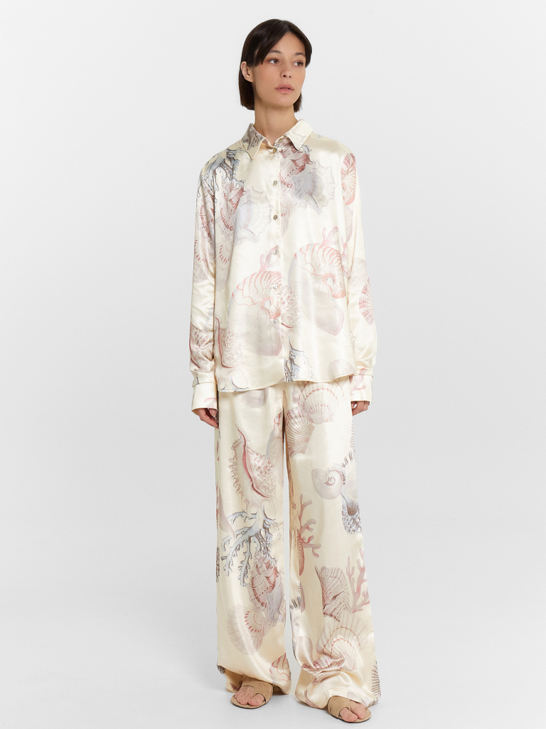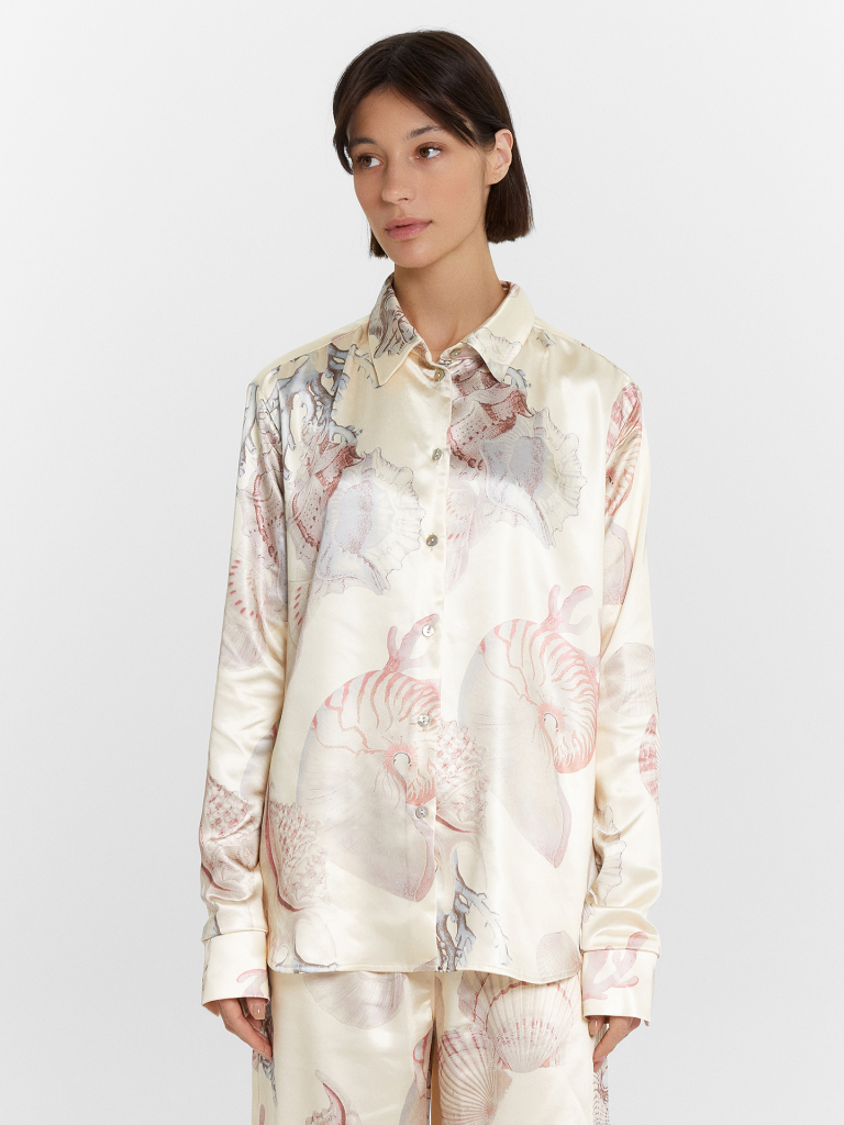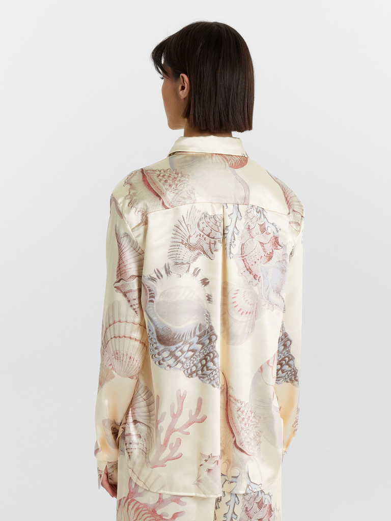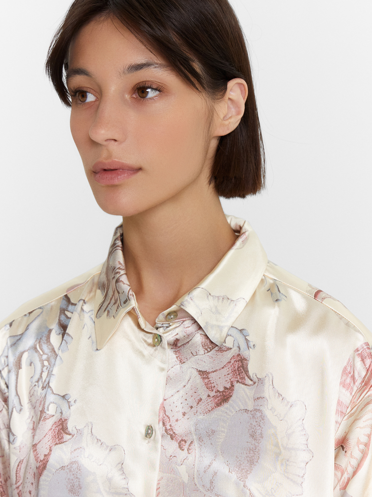 Эта женская блузка из сатиновой ткани воплощает элегантность и изящество, подходя для самых разнообразных случаев. Сатиновая ткань обладает рядом преимуществ: она славится своим шелковистым блеском, мягкостью и гладкостью, создавая эффектный и дорогой внешний вид. Благодаря особому переплетению нитей, сатин отличается высокой прочностью и долговечностью, а также обеспечивает хорошую воздухопроницаемость, что делает его комфортным даже для длительного ношения. Этот материал приятен к коже и создает ощущение легкости и роскоши. Модель выполнена со стояче-отложным воротником, добавляющим модели стильности и строгой элегантности. Застежка на пуговицы подчеркивает универсальность и практичность изделия. Слегка спущенное плечо и длинные рукава с манжетами делают дизайн актуальным и современным, сохраняя комфорт при носке. Удлиненный крой с округлым низом придает модели легкую непринужденность и стильный силуэт, который отлично подойдет как для повседневных образов, так и для более официальных случаев. Эта блузка станет изысканным элементом вашего гардероба, подчеркивая ваш безупречный вкус и утонченность.