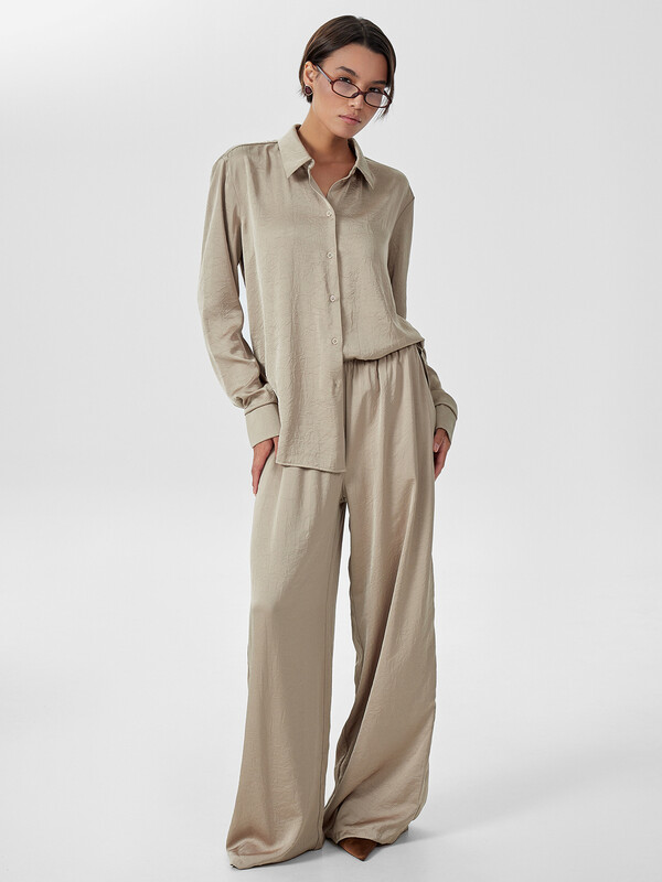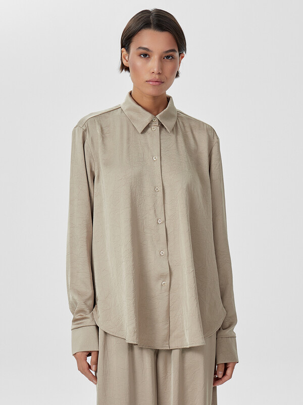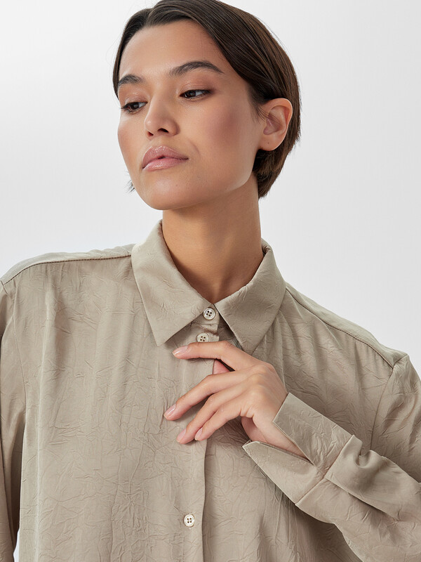 Женская блузка прямого силуэта из сатиновой ткани — это элегантная и утонченная модель, подходящая как для делового образа, так и для повседневной носки. Материал с лёгким блеском придает изделию нарядность и делает его визуально более изысканным. Горловина оформлена стояче-отложным воротником, который добавляет строгости и классики, а центральная застёжка на пуговицы делает блузку удобной и функциональной. Слегка спущенное плечо и длинный рукав создают расслабленный силуэт, а широкий манжет с разрезом по низу добавляет интересный акцент и подчеркивает внимание к деталям. Удлиненный крой с фигурным низом визуально вытягивает силуэт и позволяет носить блузку как навыпуск, так и заправленной. Это универсальная вещь, которая легко впишется в гардероб и будет сочетаться с брюками, юбками или джинсами.