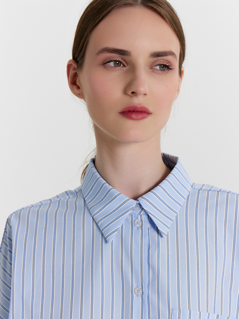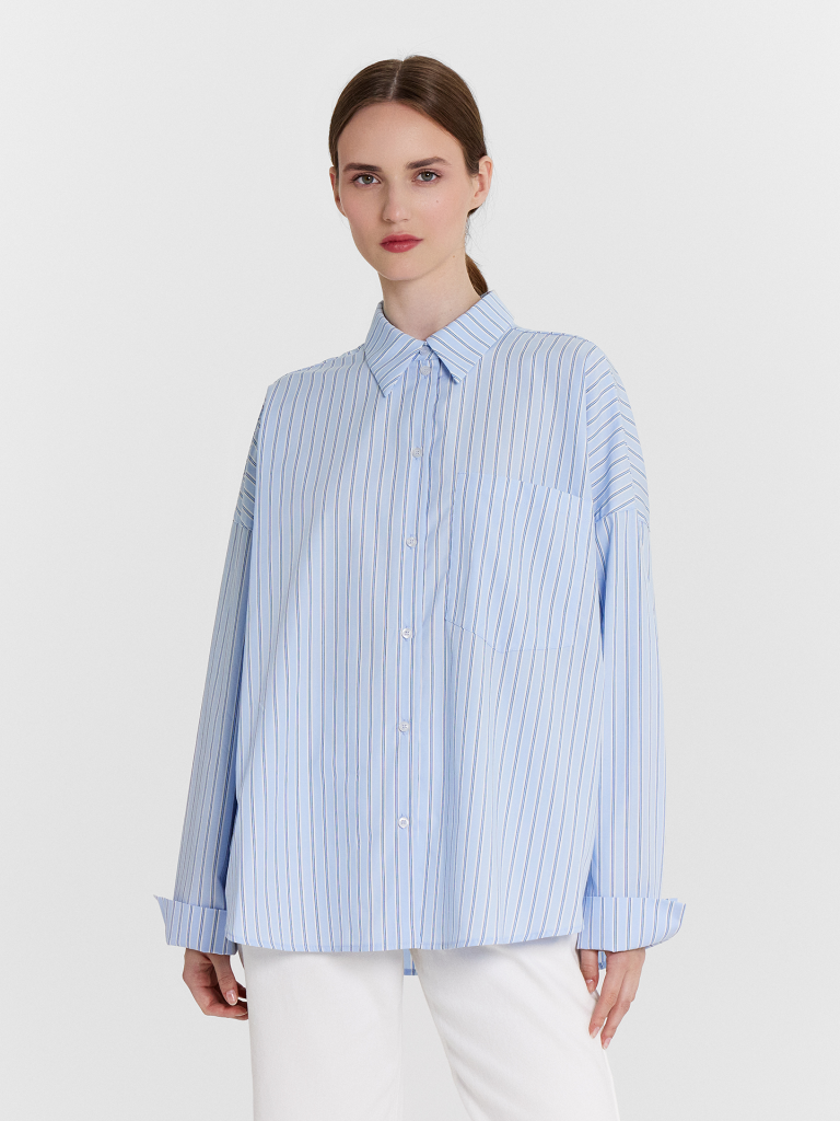 Эта женская рубашка свободного силуэта — стильное и универсальное дополнение гардероба. Круглая горловина с отложным воротником придает образу классическую элегантность, а спущенное плечо и углубленная пройма создают расслабленный силуэт. Длинные рукава с манжетами и декоративными разрезами добавляют изысканности, а застежка на пуговицы по центру делает модель удобной и практичной. Спереди накладной карман придает рубашке функциональность и стильный акцент. Спинка с отрезной кокеткой и складкой по центру подчеркивает красивый силуэт, а закругленный низ добавляет мягкость линиям. Выполненная из натурального хлопка, рубашка приятна к коже, дарит комфорт и идеально подходит для повседневных расслабленных образов. Дополните ее подходящими брюками из этой же коллекции и создайте элегантный и гармоничный комплект!