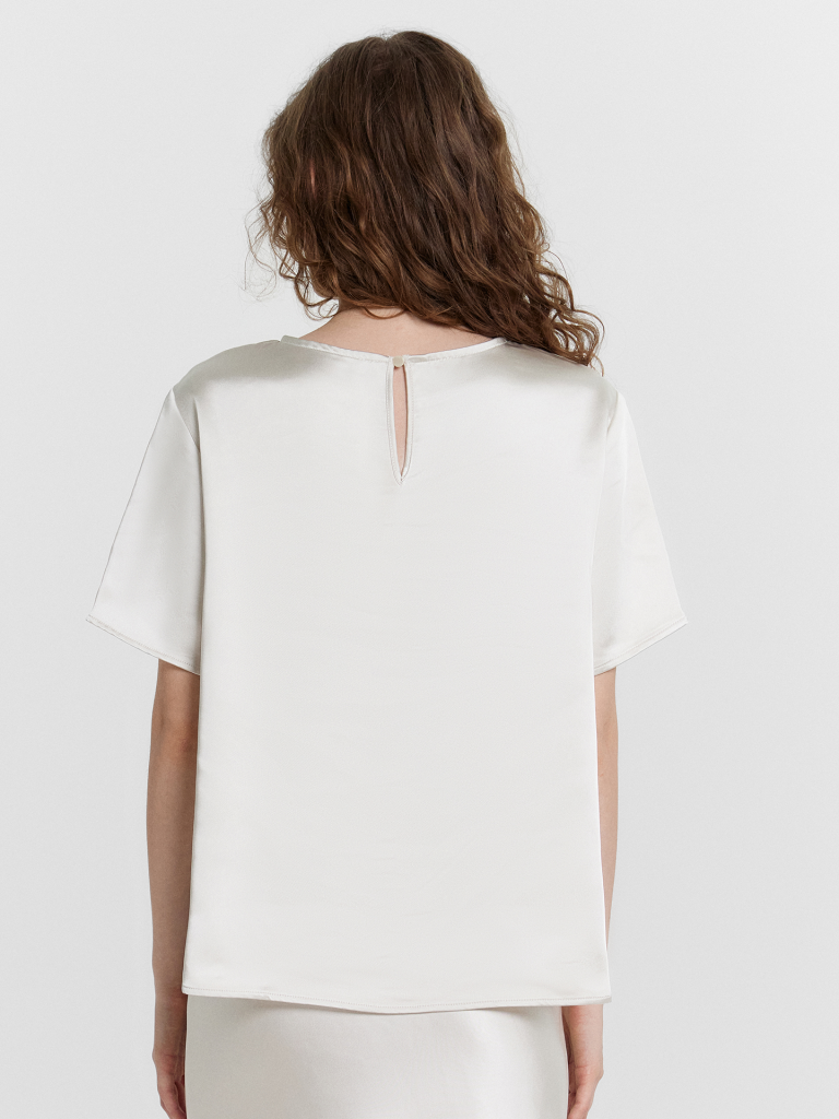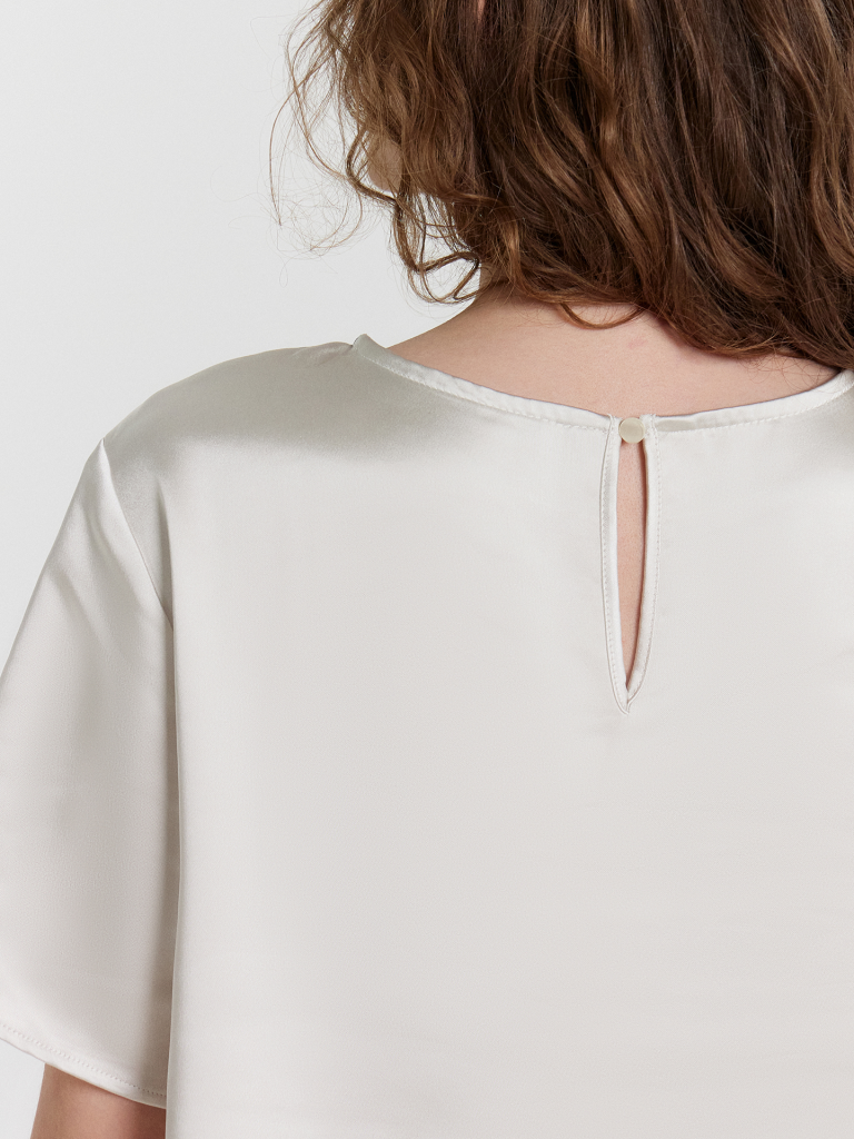 Эта женская блузка прямого силуэта — воплощение элегантности и изысканности, благодаря высококачественному материалу, напоминающему шелк своей гладкой текстурой и мягким блеском. Такой материал не только визуально привлекательный, но и комфортный в носке, обеспечивая легкость и стиль одновременно. Модель выполнена с круглой горловиной, что подчеркивает ее лаконичный и аккуратный дизайн. Застежка на спинке с эластичной тесьмой и пуговицей добавляет удобство и изящный акцент. Короткие рукава придают изделию универсальность, подходя как для теплого сезона, так и для сочетания с верхней одеждой. Нижние срезы рукавов обработаны швом вподгибку, что обеспечивает долговечность и аккуратность. Эта блузка станет прекрасным дополнением вашего гардероба, подойдя как для создания повседневных образов, так и для более официальных случаев. Рекомендуем!