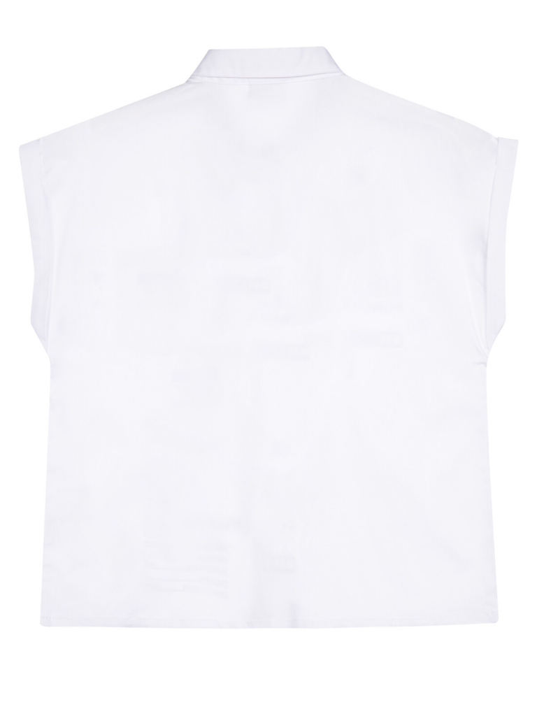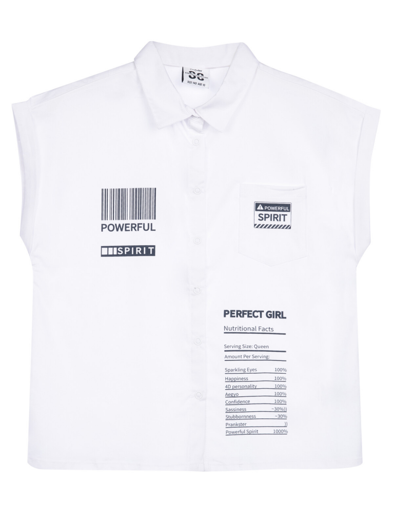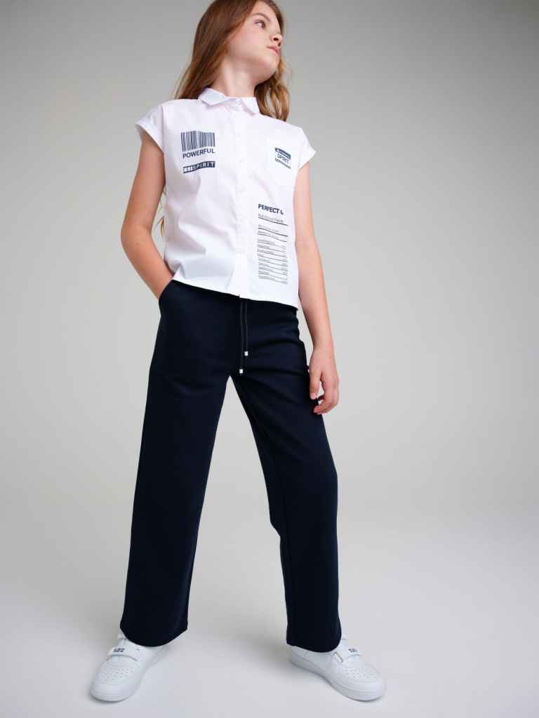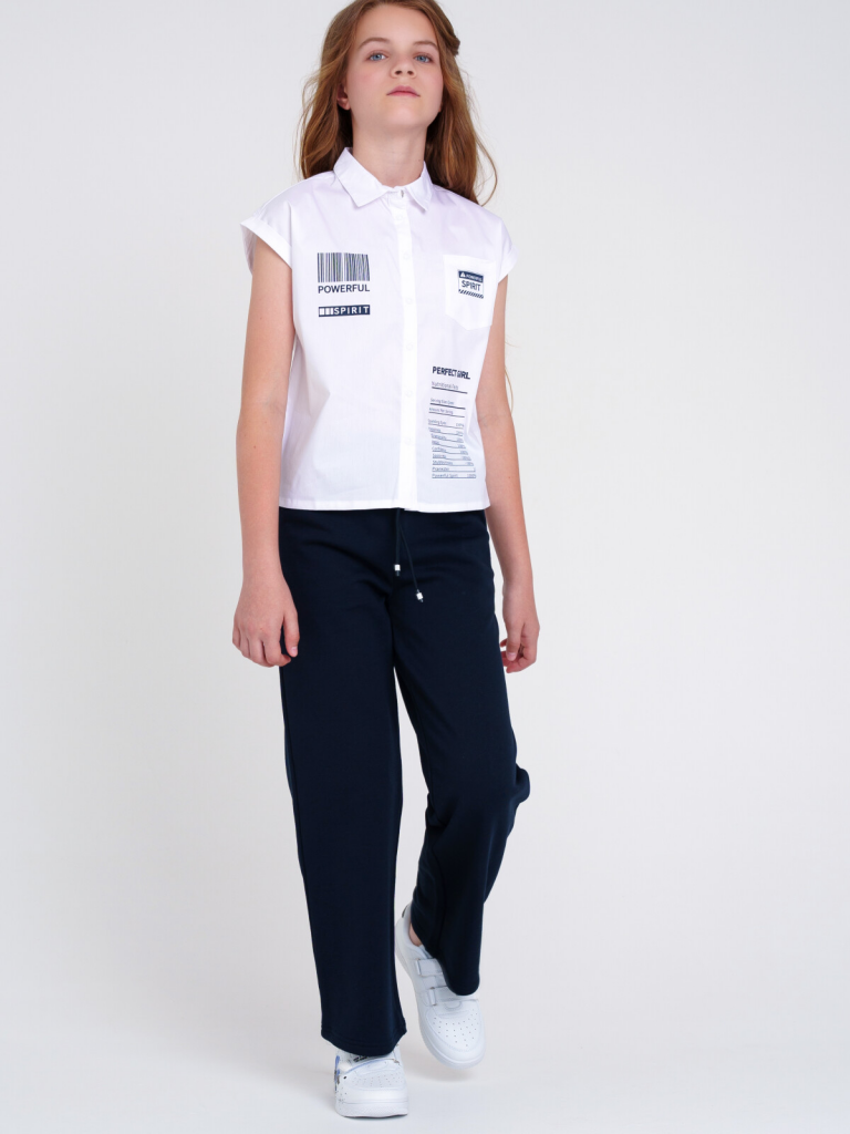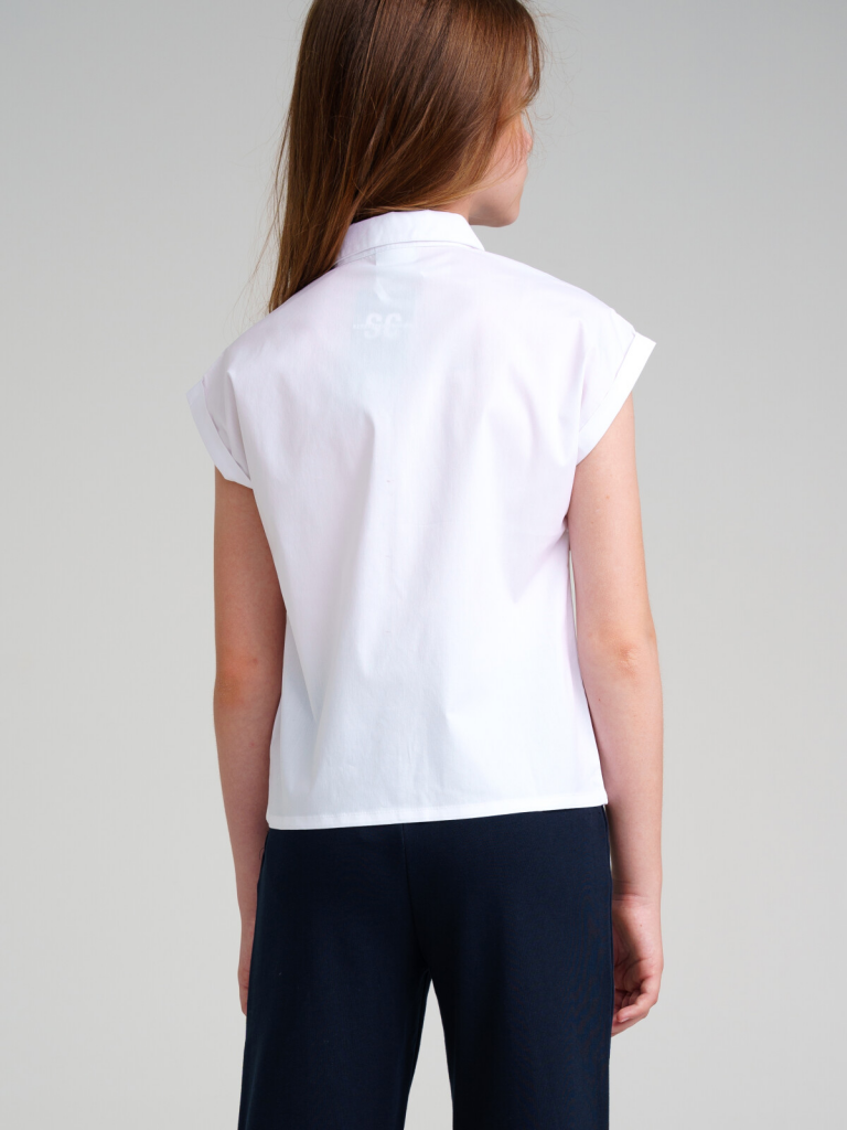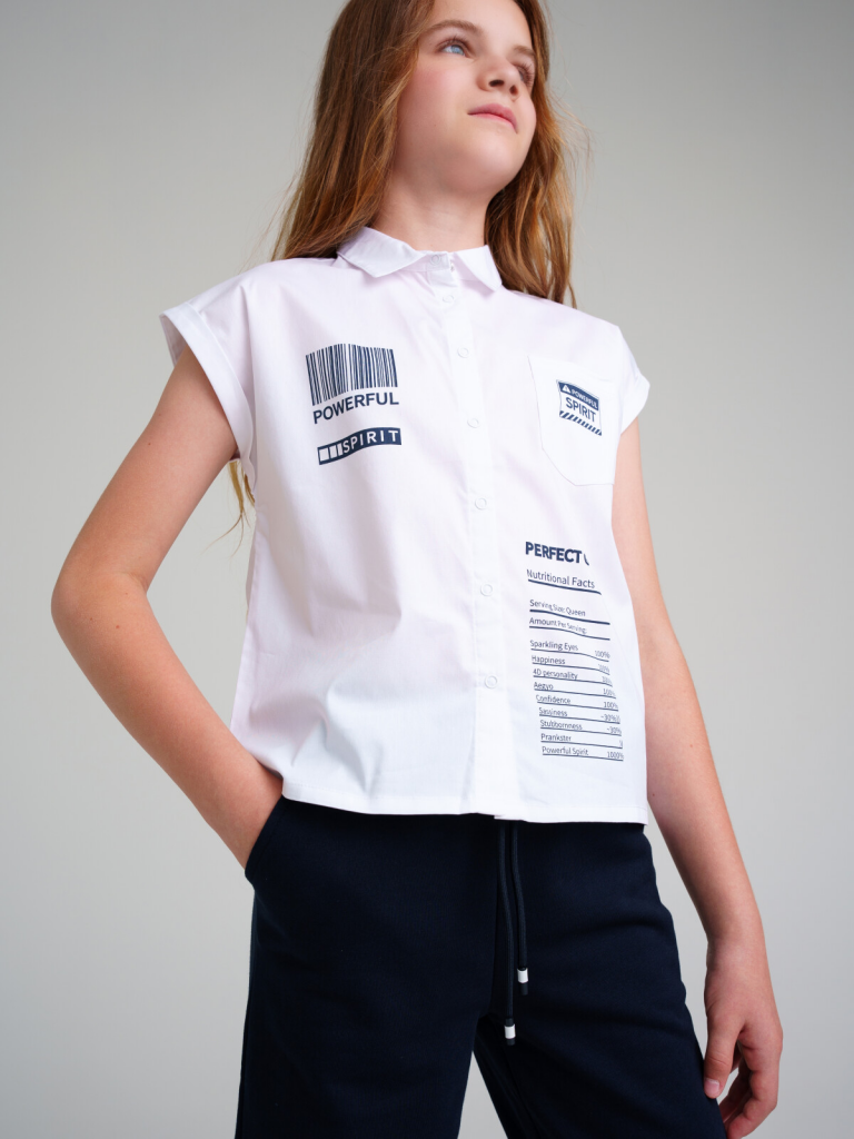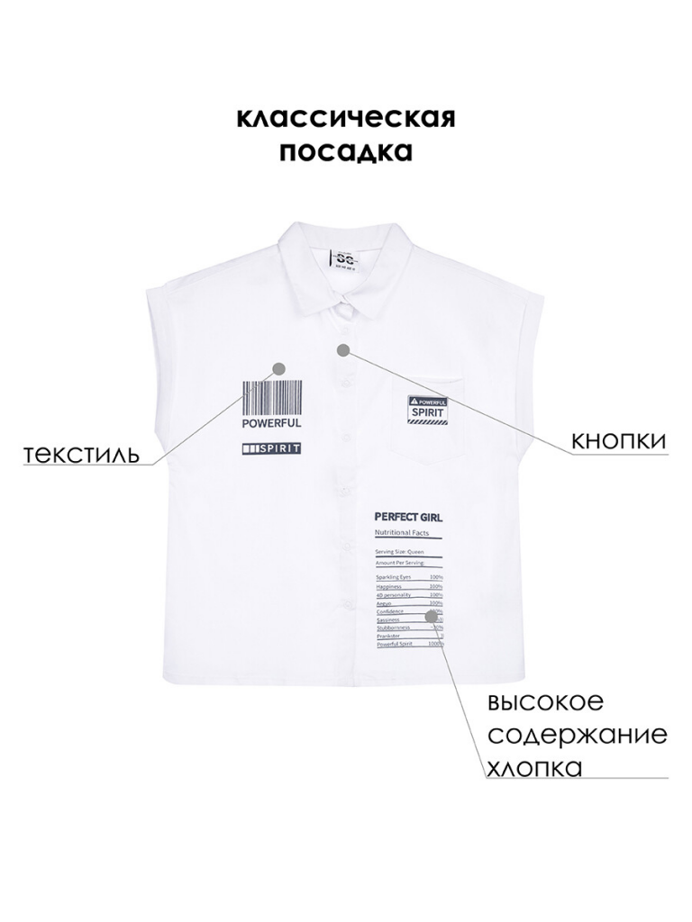 Белая нарядная текстильная блузка прямого силуэта для девочки подростка. Школьная блузка на кнопках хорошо держит форму, комфортна в носке и проста в уходе. Высокое содержание хлопка. Рубашка в школу с коротким рукавом и интересным принтом разнообразит повседневные школьные образы.