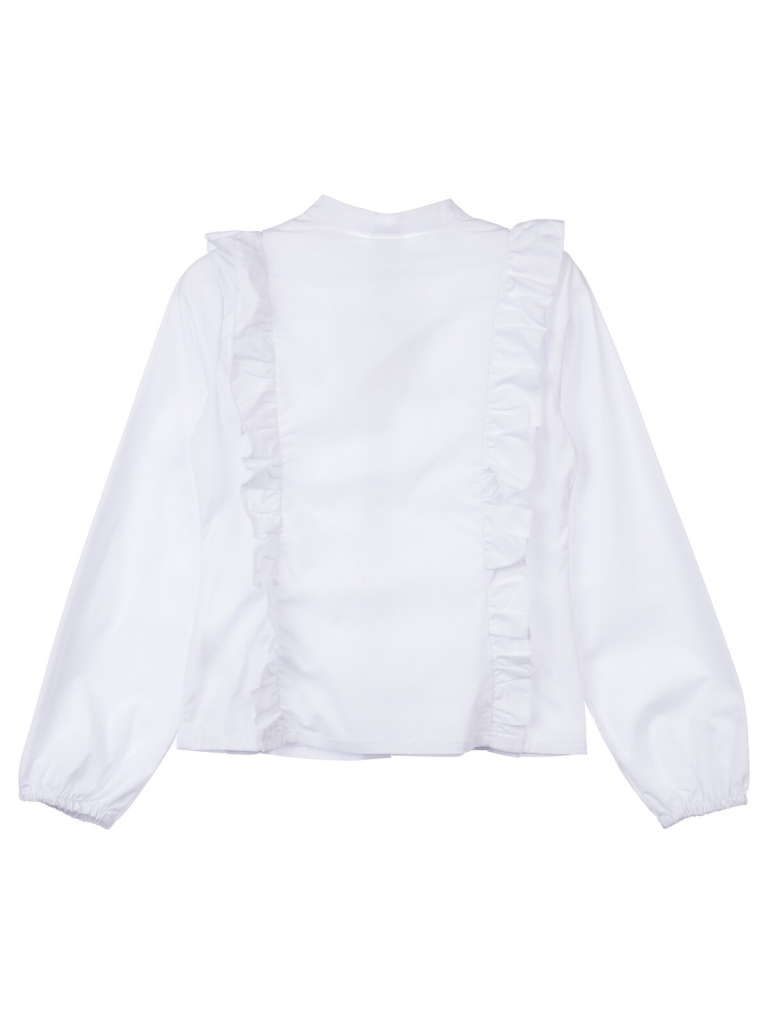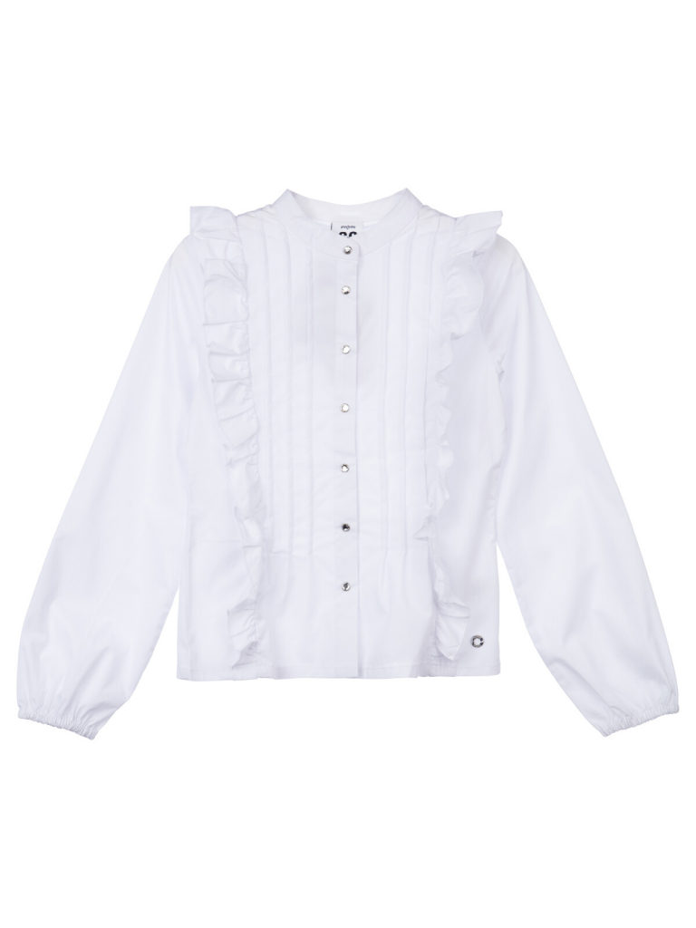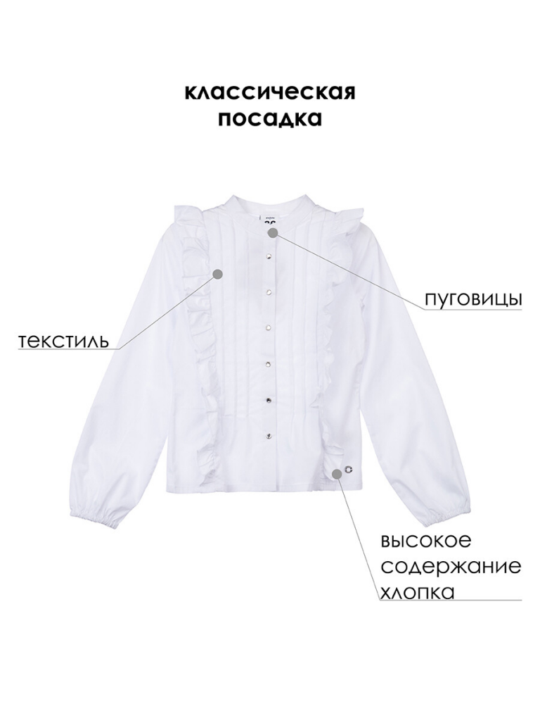 Белая нарядная текстильная блузка прямого силуэта, приталенная для девочки подростка. Школьная блузка на кнопках хорошо держит форму, комфортна в носке и проста в уходе. Высокое содержание хлопка. Рубашка в школу с длинным рукавом и интересным дизайном разнообразит повседневные школьные образы.