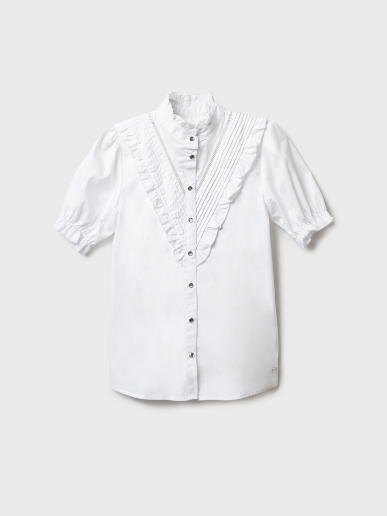 Белая нарядная блузка с коротким рукавом для школыИдеальный вариант на 1 сентября и для повседневной носки! Эта текстильная блузка сочетает нарядный дизайн и комфорт для учебы.Ключевые особенности:+ Романтичные рюши и воланы по переду - создают праздничный образ+ Удобная застежка на пуговицы - легко надевать самостоятельно+ Посадка comfort - не сковывает движения во время занятий+ Резинка на рукавах - обеспечивает идеальную посадкуПочему стоит выбрать:Подходит как нарядный вариант на 1 сентября, так и для повседневной носкиУдобный крой для девочки-школьницы и подростка.