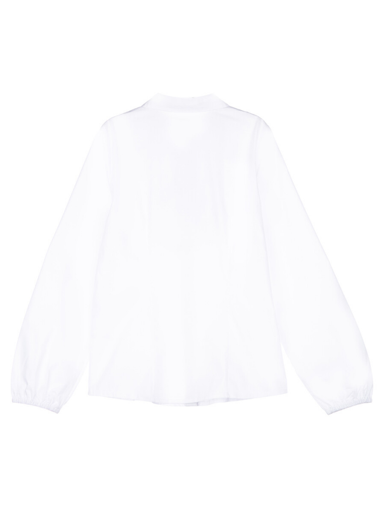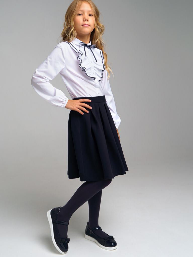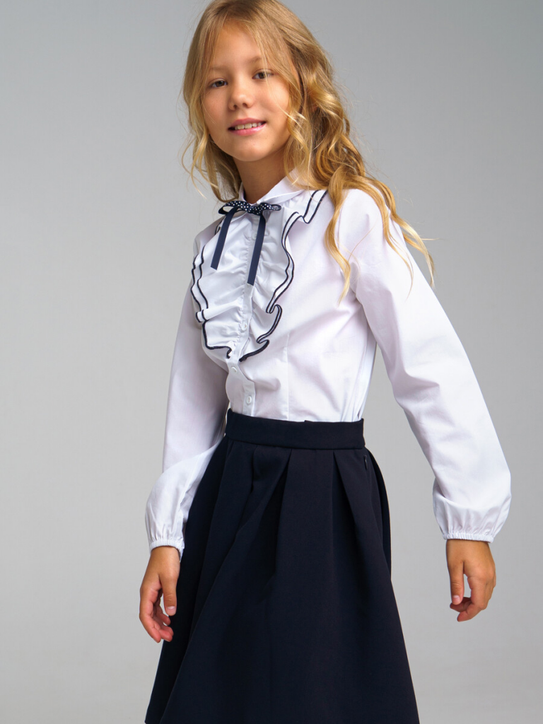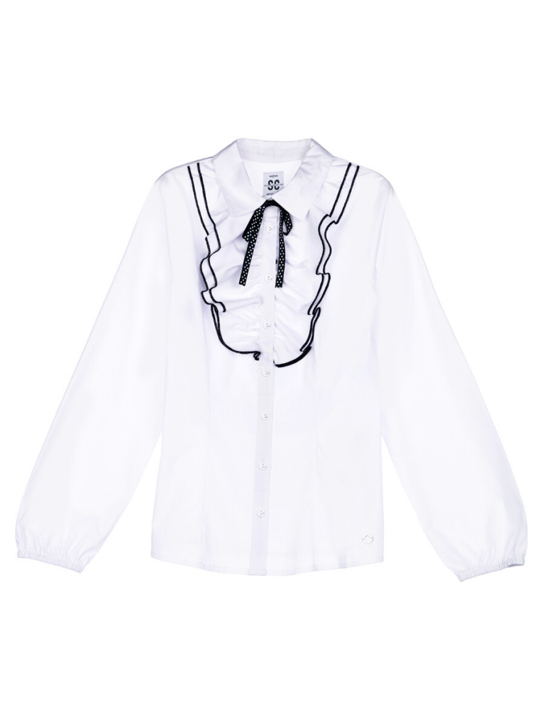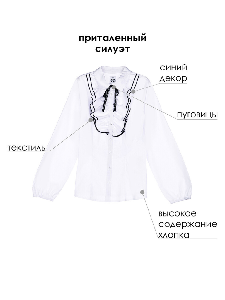 Белая нарядная текстильная блузка полуприлегающего силуэта, приталенная для девочки подростка. Школьная блузка на пуговицах хорошо держит форму, комфортна в носке и проста в уходе. Высокое содержание хлопка. Рубашка в школу с длинным рукавом и декоративной рюшей разнообразит повседневные школьные образы.